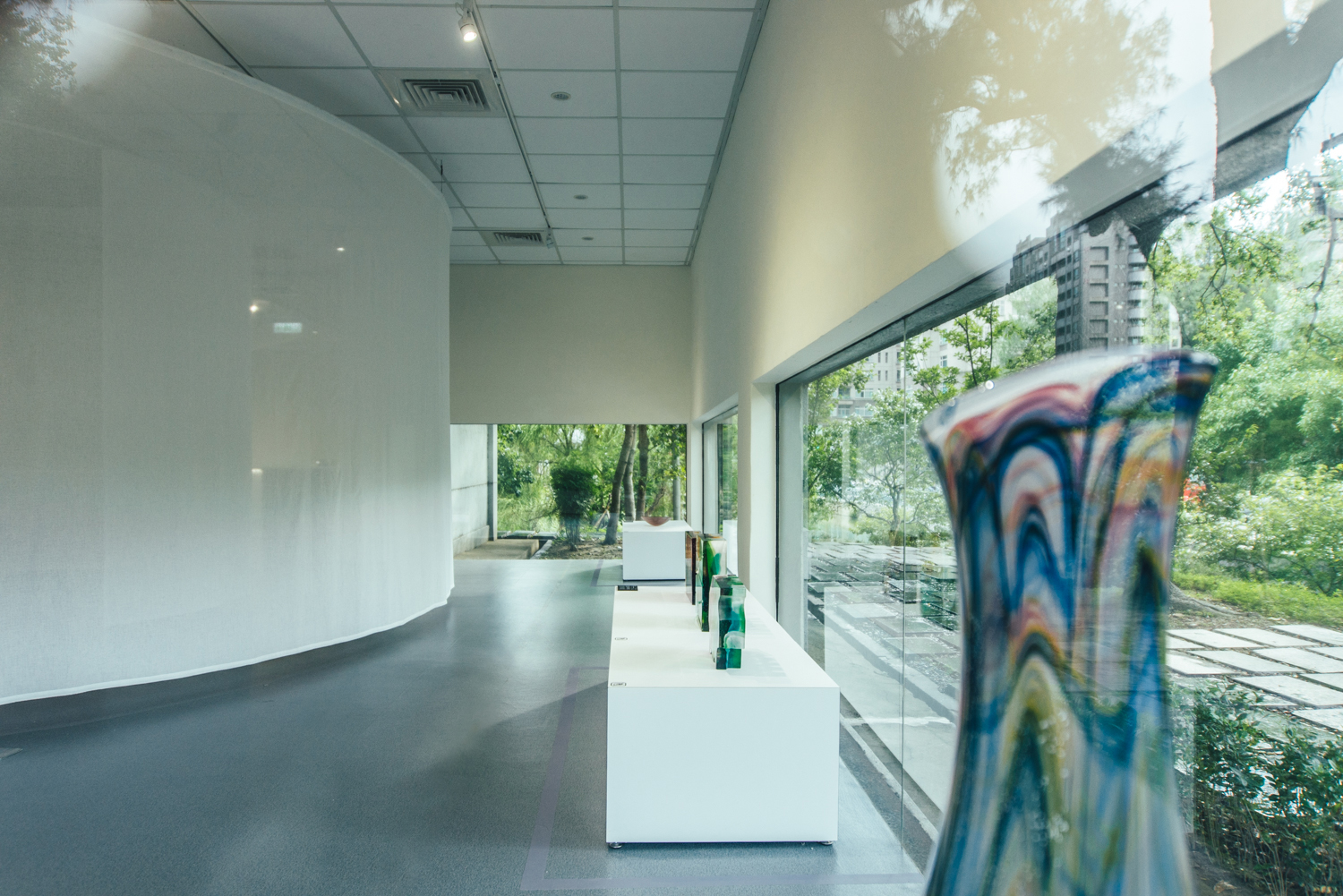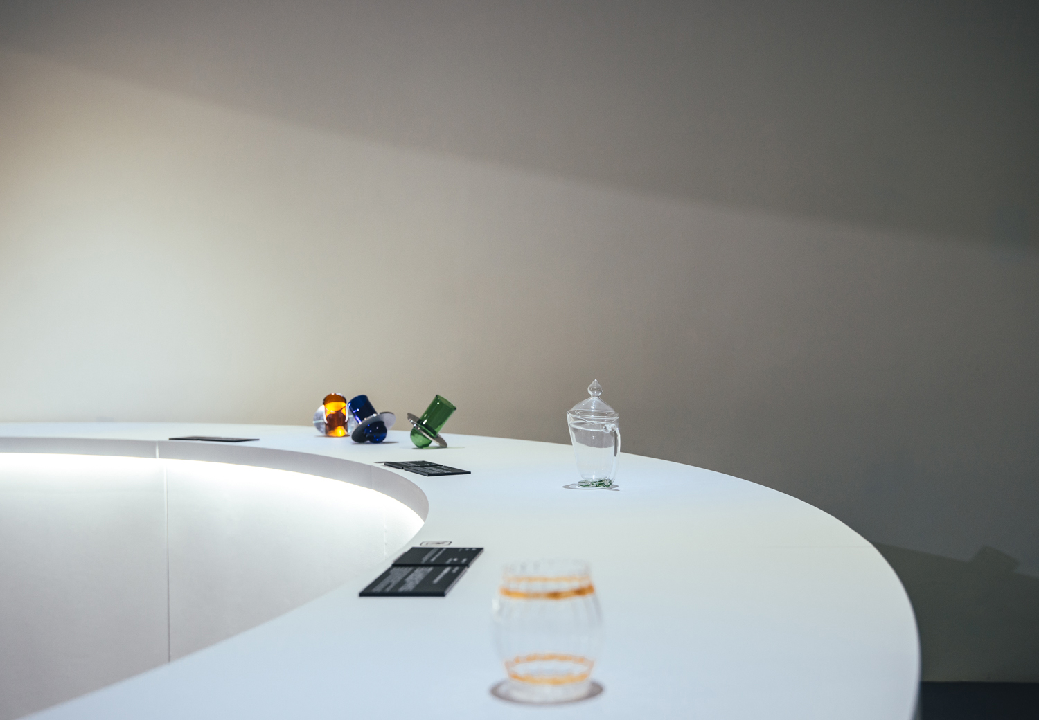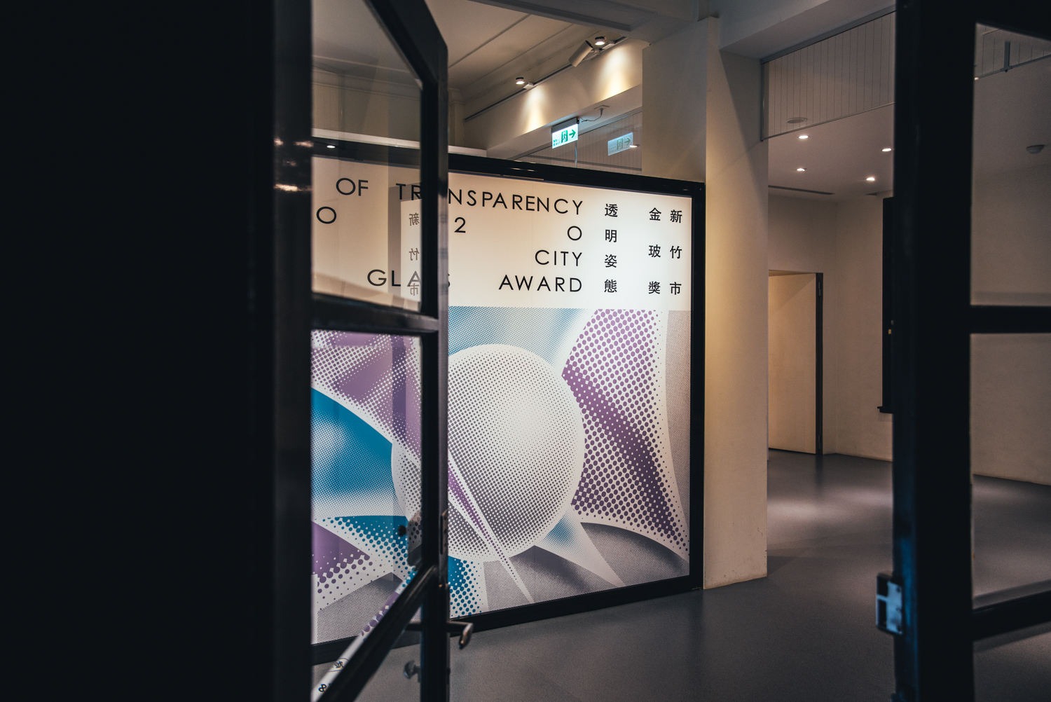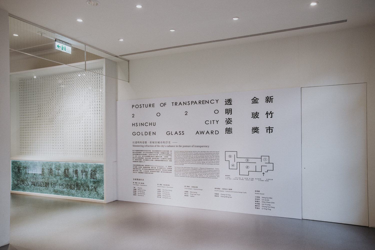 兩個主要展間一圓一方,象徵玻璃有稜角有圓滿、隨物賦形、或方或圓的特質;一黑一白,象徵玻璃、光與空間的溝通,也比喻破碎與重生,是永續的姿態。