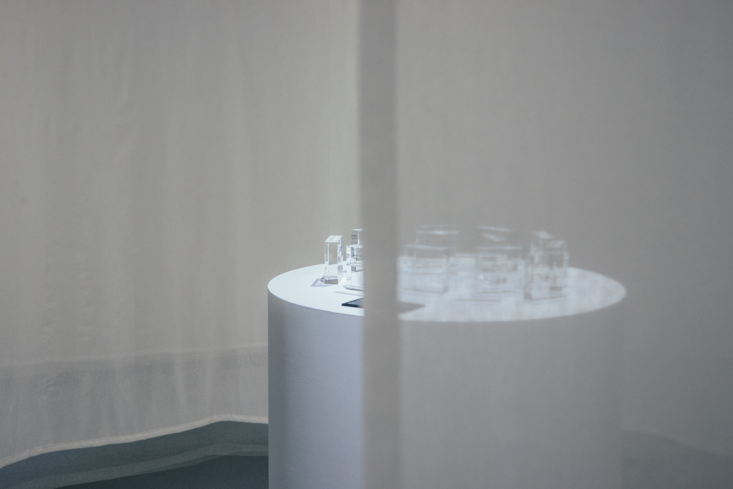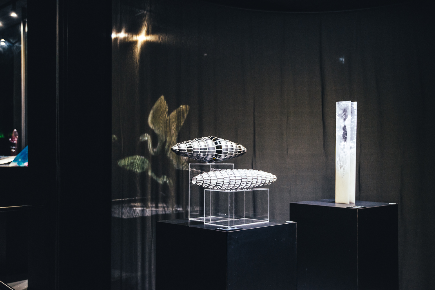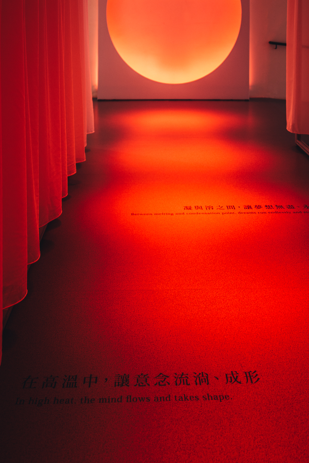 以織布為主要展場分區素材,布料本身透光、彈性可延展的材料特性,剛好跟剛硬剔透的玻璃材質對話。織布交疊成大小不一、如同洞穴般的區域,在燈光設計之下,帶領觀者進入一個又一個創作者的內心世界。