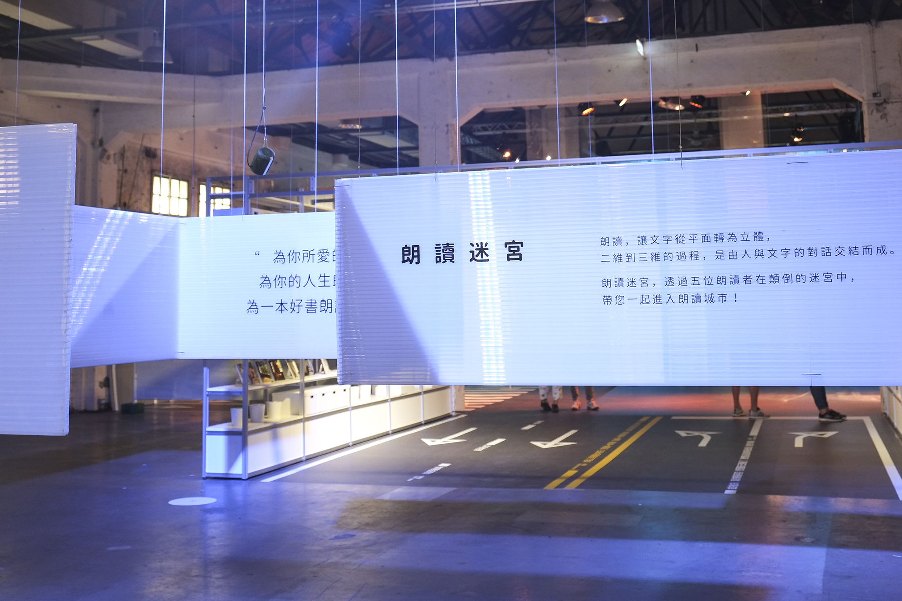 觀眾於入場處就遇見懸吊空中的迷宮,邀請五位不同領域的歌手、作家、以及詩人,錄製一段朗讀其推薦書籍的語音,以及一段對閱讀的感想。透過如同與觀眾面對面說話一般的口吻,以及真實收錄錄製語音時的背景環境聲音,讓觀眾於一進入,就能身歷閱讀的世界。