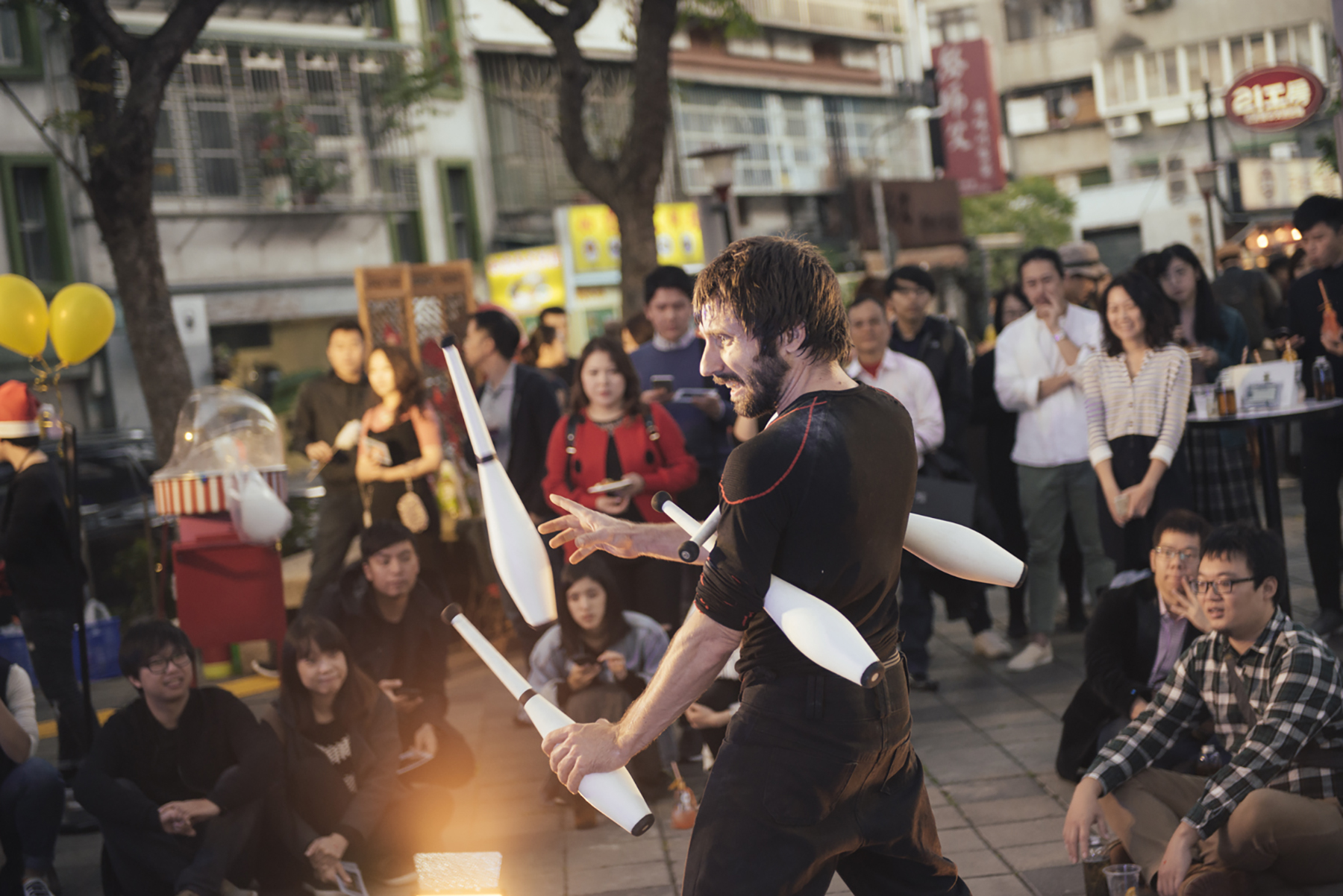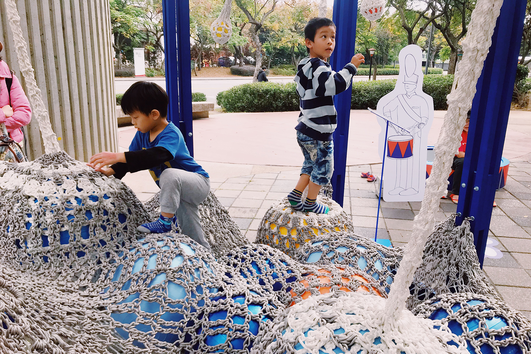 在 12/23-12/30 將四種表演藝術型態 #音樂、#戲劇、#舞蹈、#雜技 重新轉譯,於台北市捷運圓山站線形公園設置四座互動藝術裝置,交替「表演者」與「觀者」之間的界線。其中代表 #雜技 的互動藝術裝置特別邀請設計師曾靖婷(現為織築負責人)設計,打造一座以雜技表演為概念的織網作品。參與者小心翼翼踏上覆蓋不同編織技法的球面,試圖保持完美平衡的互動過程就是一場表演。開幕派對上也特別與 OISTAT 國際劇場組織合作,將肢體的展現融入互動遊戲之中,藉此讓賓客體驗表演的樂趣。