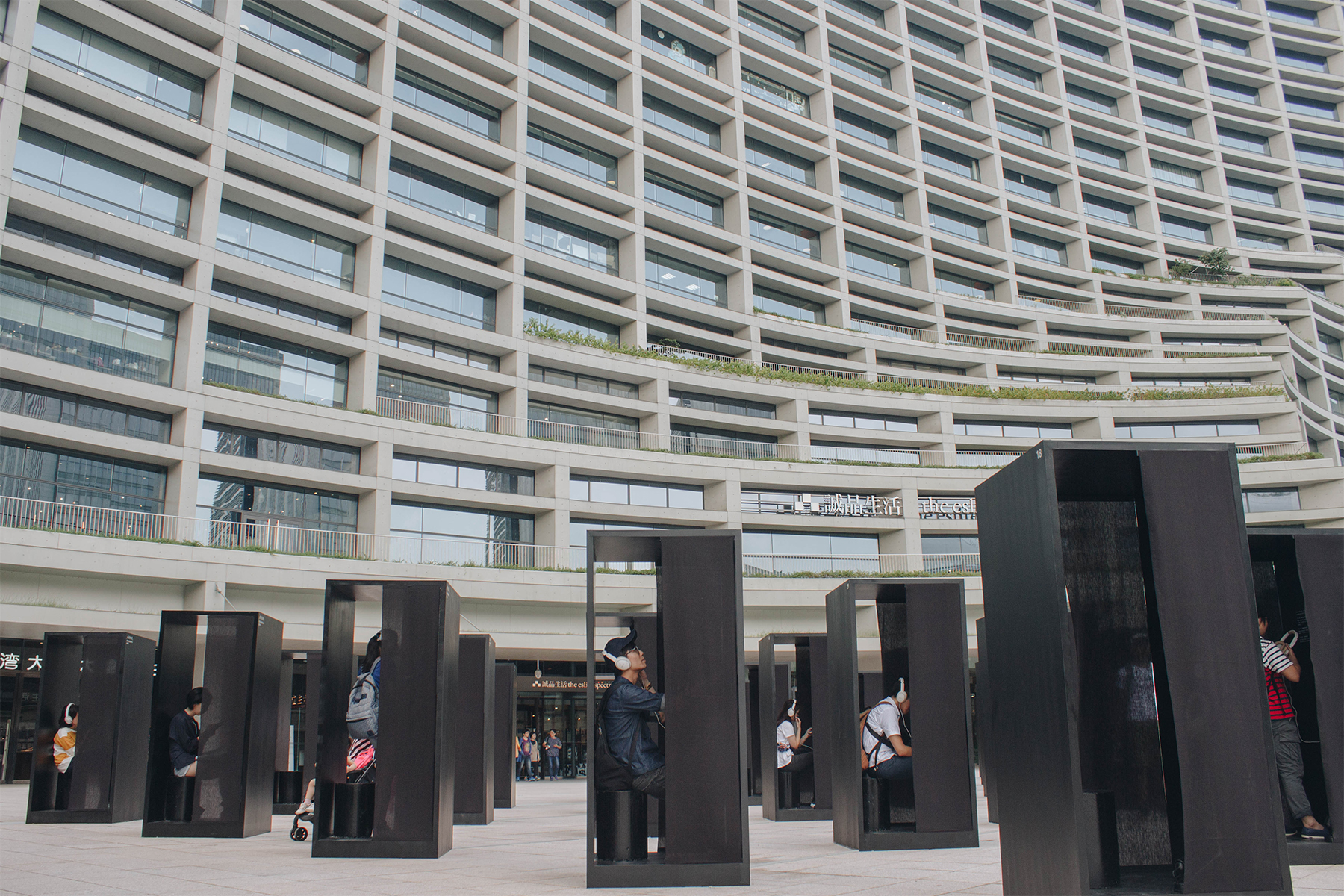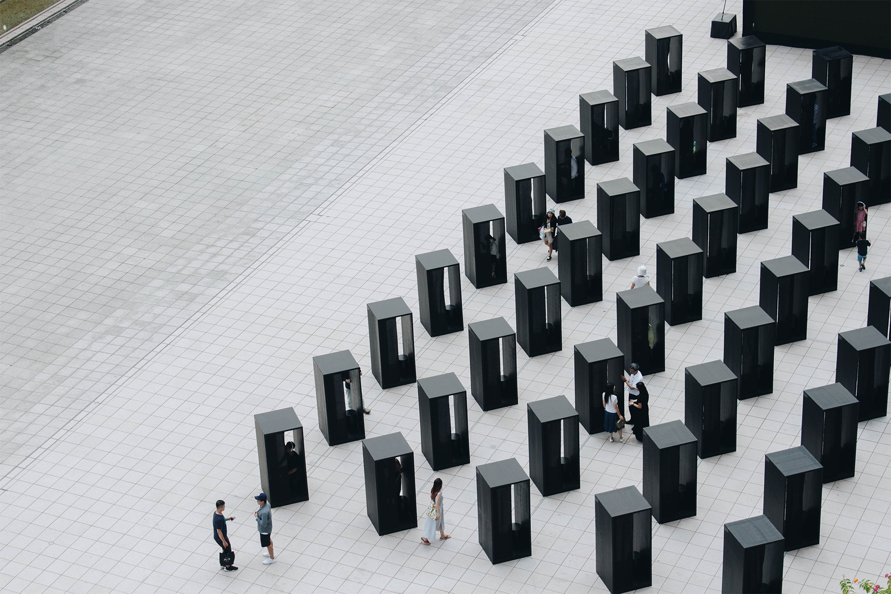 因此,廣場上的 50 個盒子設計為僅能容納一人的黑色獨立空間,並附帶半透視的遮廉,藉此屏除其他視覺干擾,也同時呼應位在廣場的公共開放性。民眾坐入、掛上耳機,與自己對話,更加沈浸於回顧青春年華的音樂記憶。