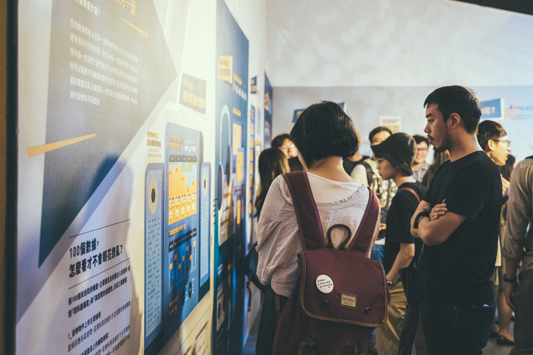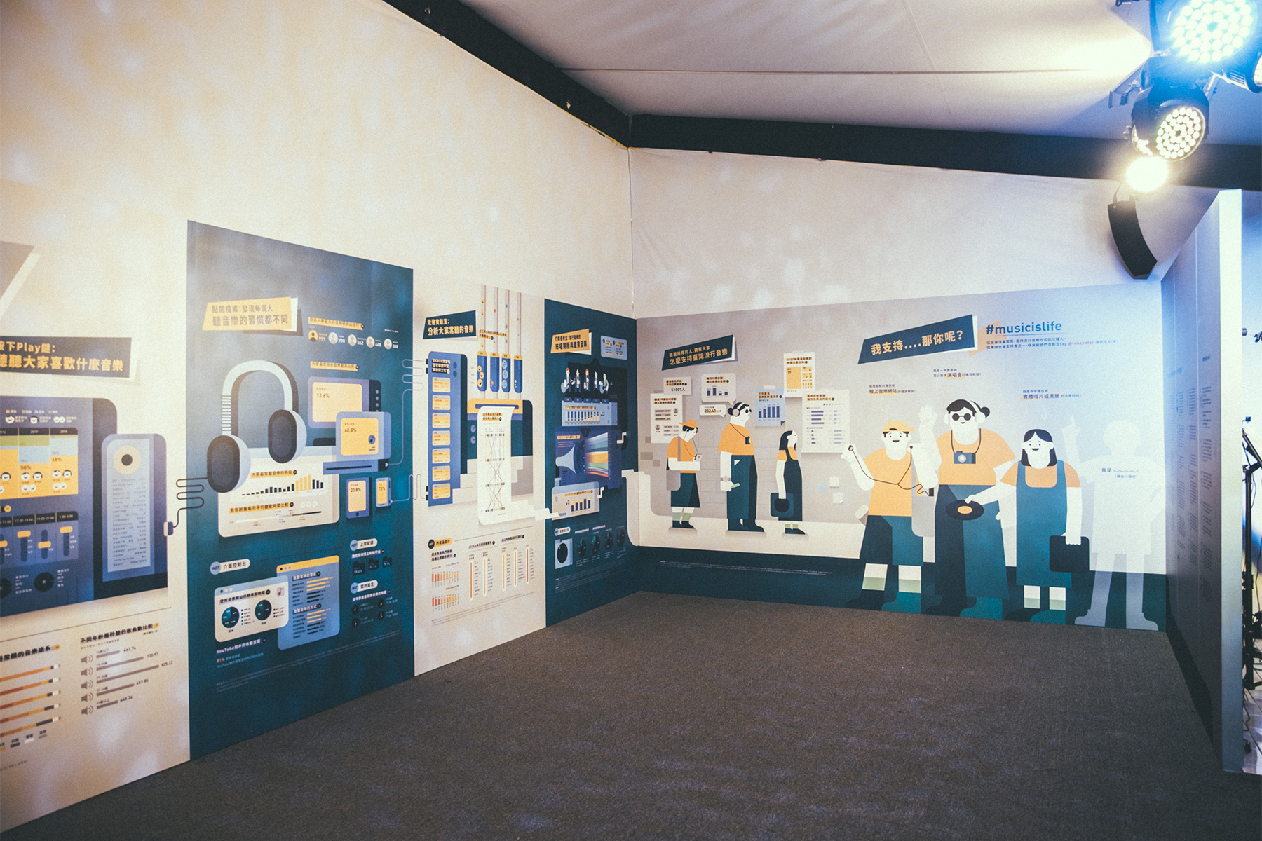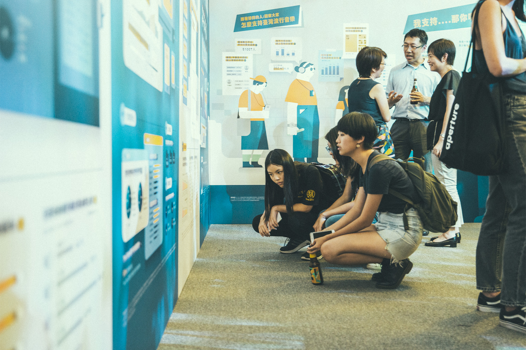 圖像資訊以大幅輸出的形式呈現,讓數據細節符合使用者閱讀體驗的同時,也營造出豐富的視覺空間使觀者沉浸於其中。此外,於展區最後邀請 22 名資深音樂人、樂評人以及從事視覺設計、展演空間、唱片行、媒體等不同領域的評論顧問進行觀點分享,讓我們看見這些理性資料背後隱含的情感故事,勾勒出現今社會可探索的文化脈絡。