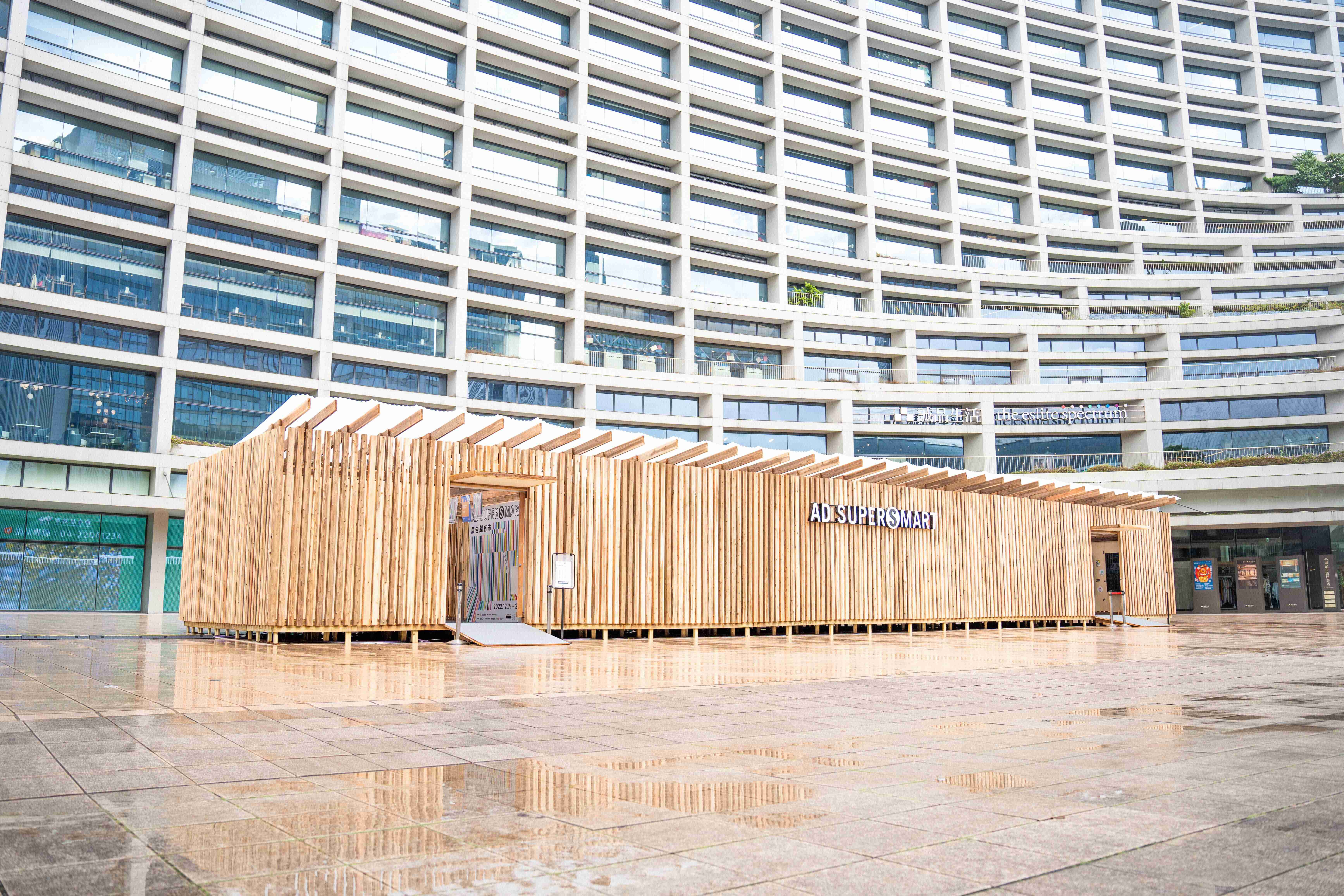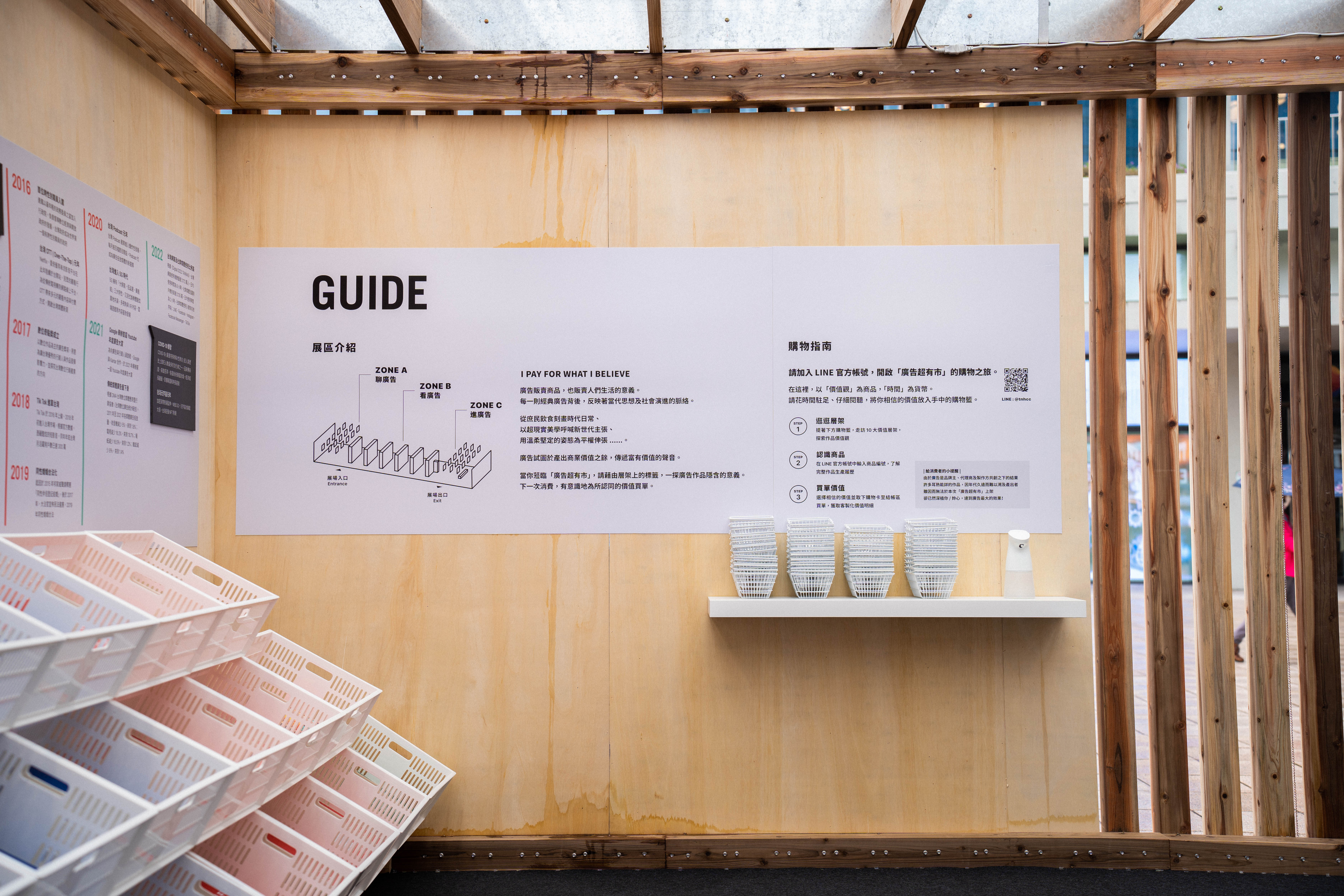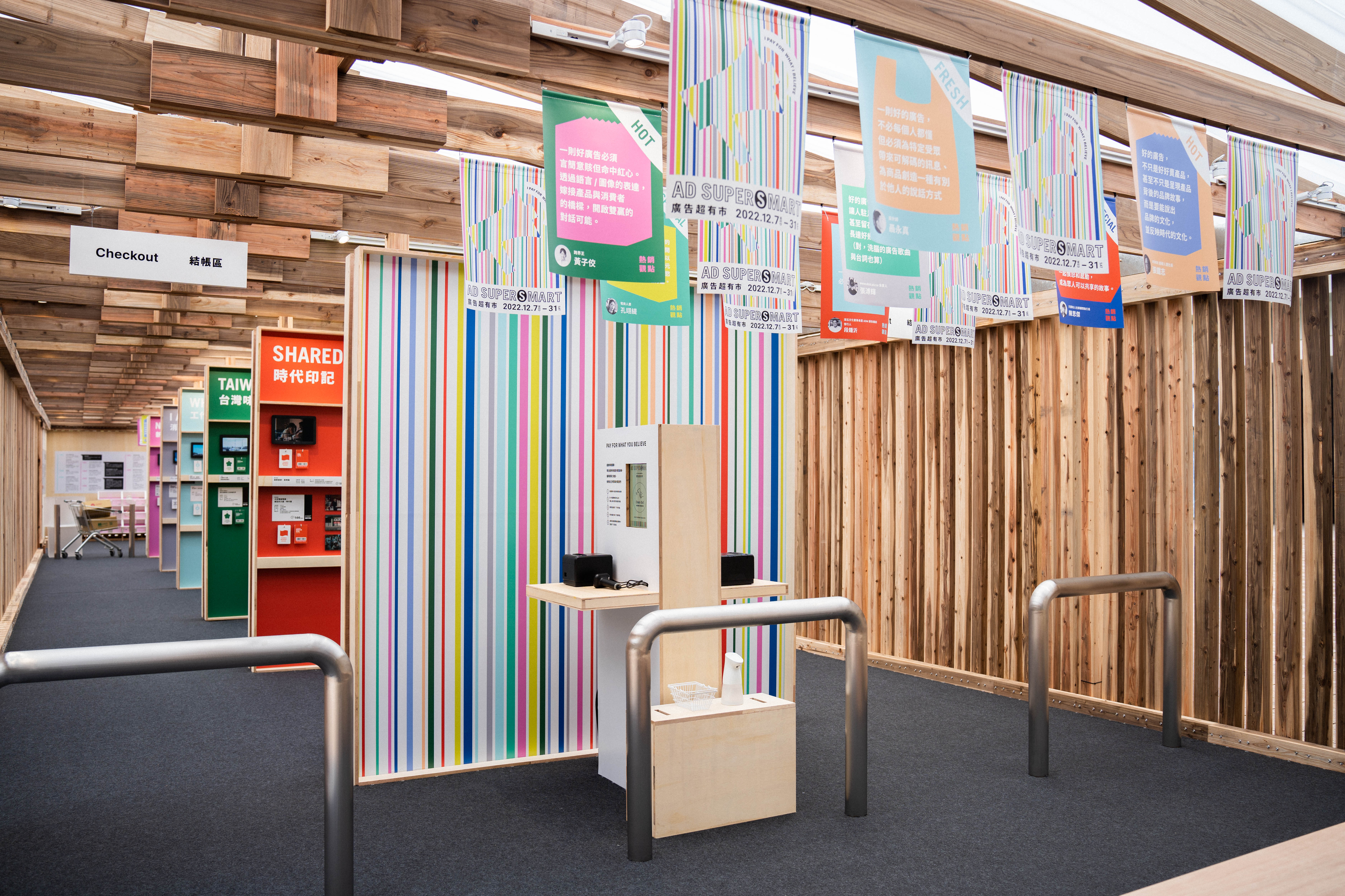 空間將整體策展核心概念「廣告」、「超市」以條碼將視覺與空間完美融合,實現了從內到外一個舒適的商店、一個充滿購物符號的場域。材質上選擇了臺灣柳杉格柵式的包覆,就像是商品上的細長條碼。此外臺灣杉木更是可回收的永續原生植材,就像經典廣告永留人心,展覽後,這些建構「廣告超有市」的木材,會循環利用,回饋至臺灣偏鄉「義築」公益行動。