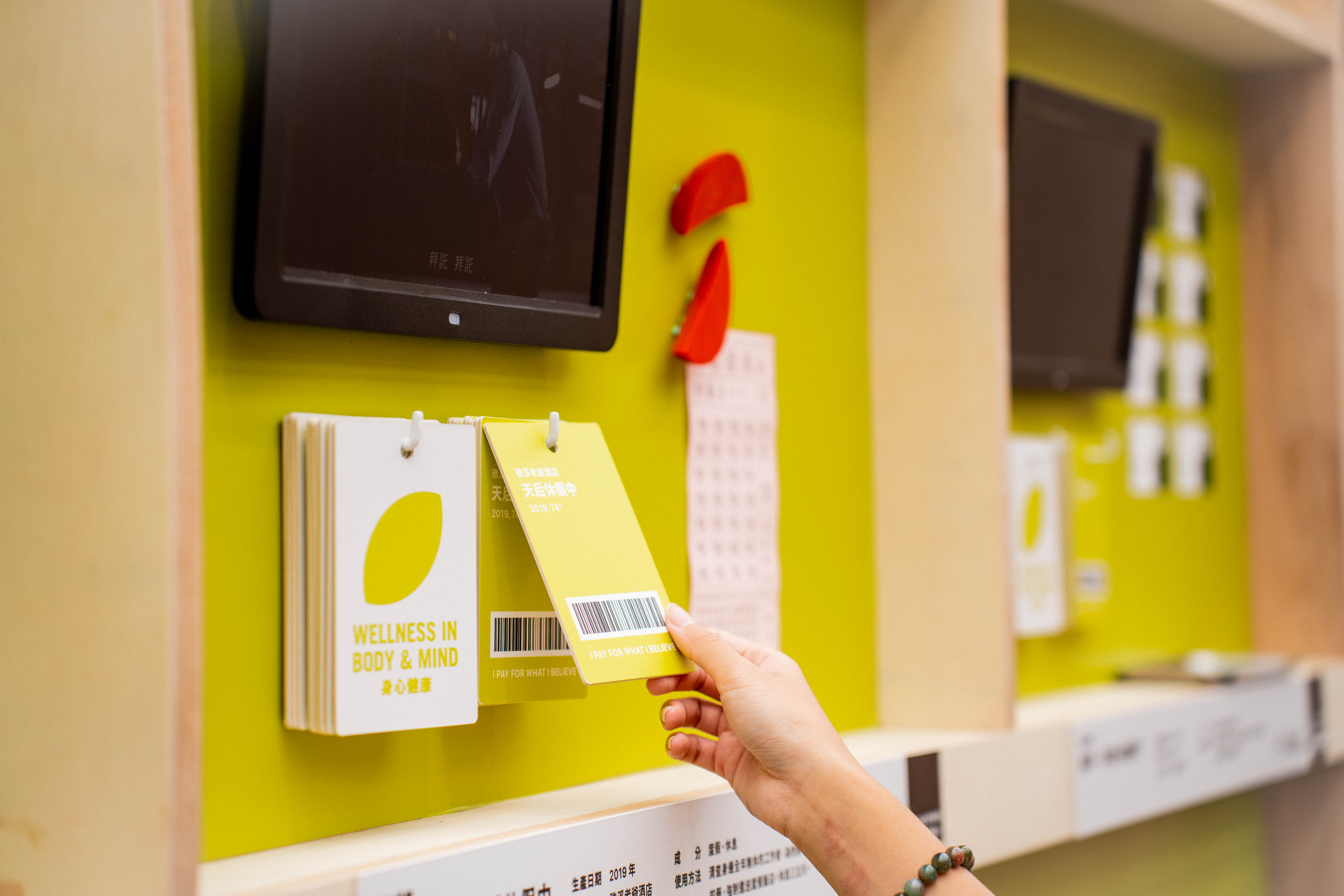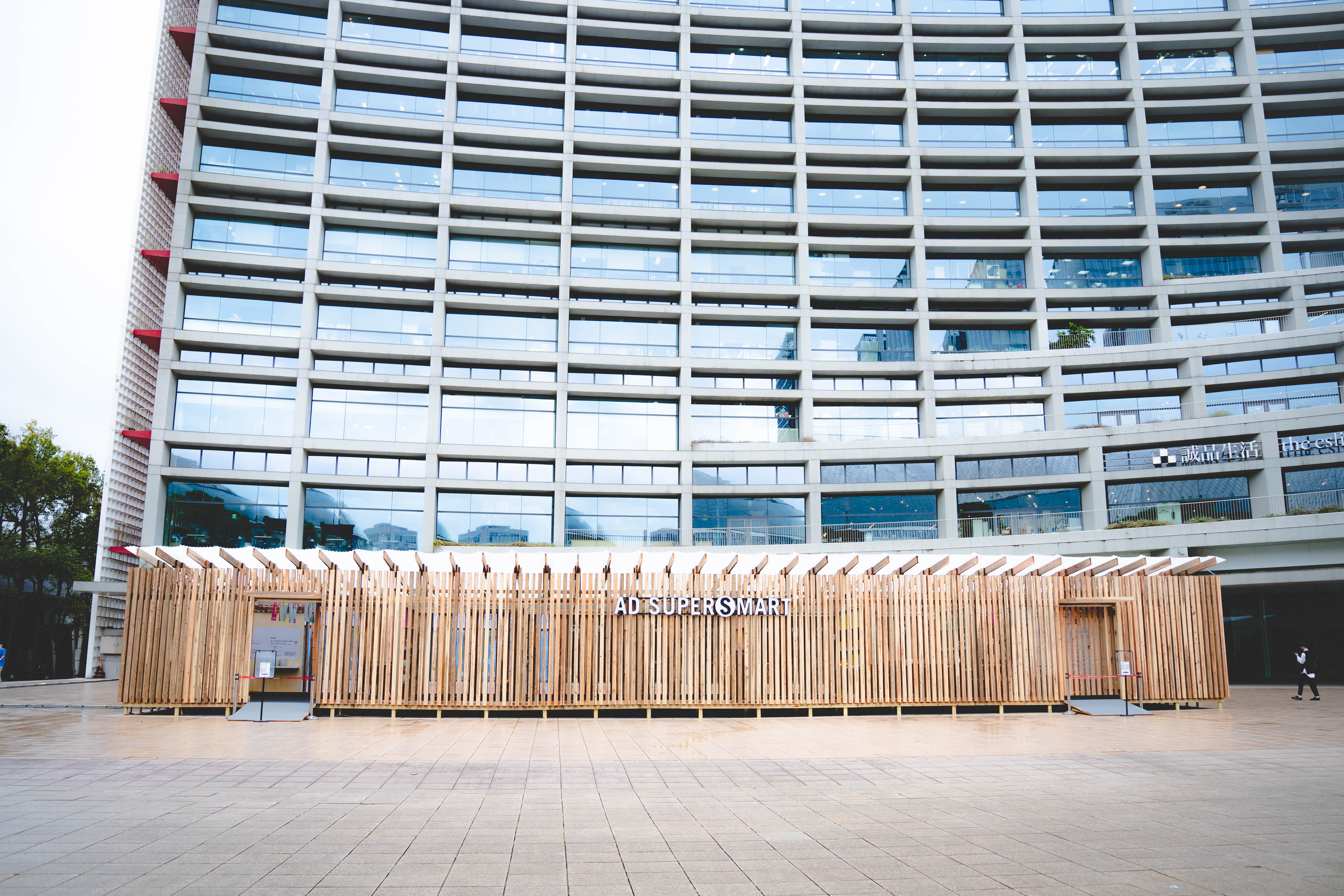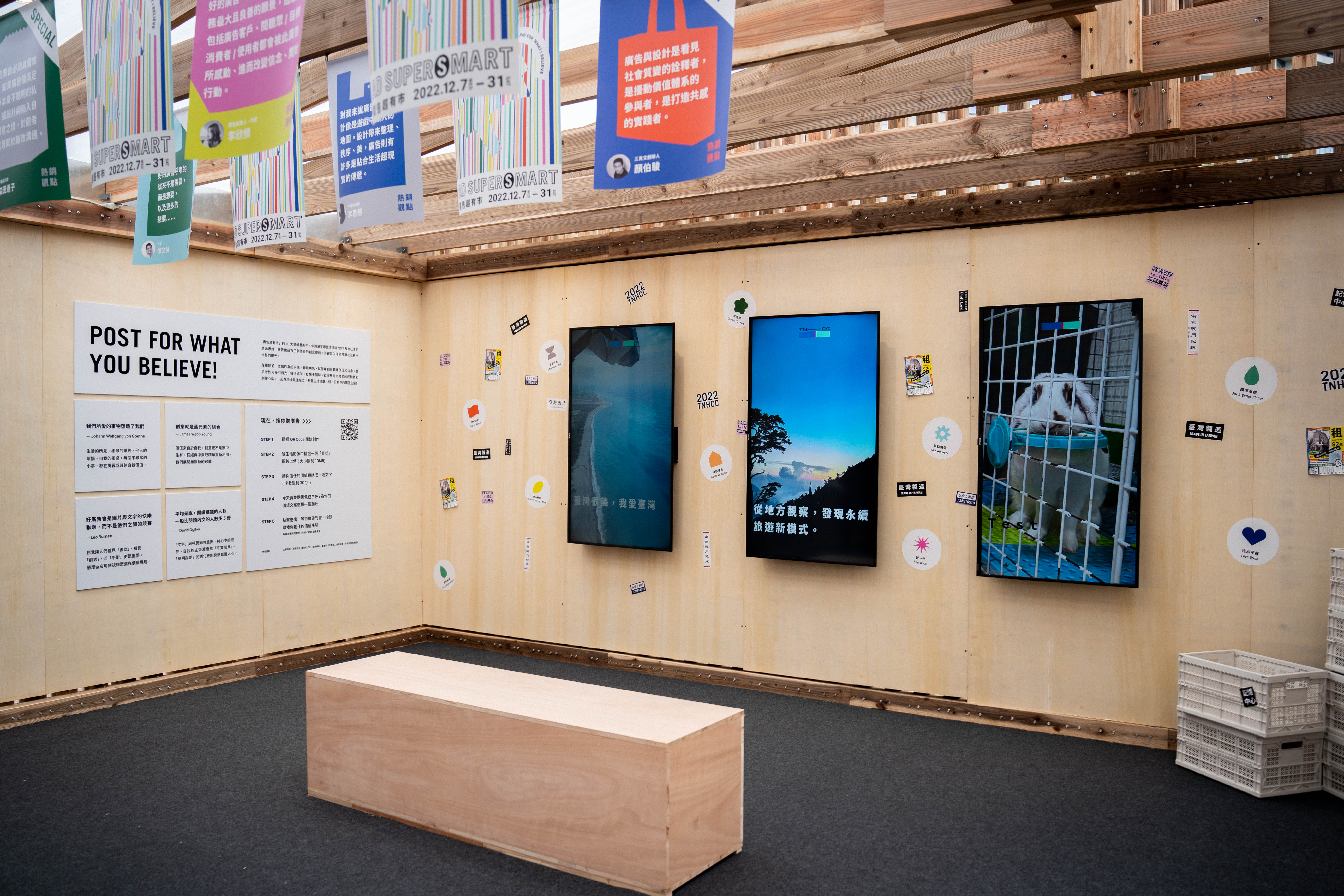 空間將整體策展核心概念「廣告」、「超市」以條碼將視覺與空間完美融合,實現了從內到外一個舒適的商店、一個充滿購物符號的場域。材質上選擇了臺灣柳杉格柵式的包覆,就像是商品上的細長條碼。此外臺灣杉木更是可回收的永續原生植材,就像經典廣告永留人心,展覽後,這些建構「廣告超有市」的木材,會循環利用,回饋至臺灣偏鄉「義築」公益行動。
