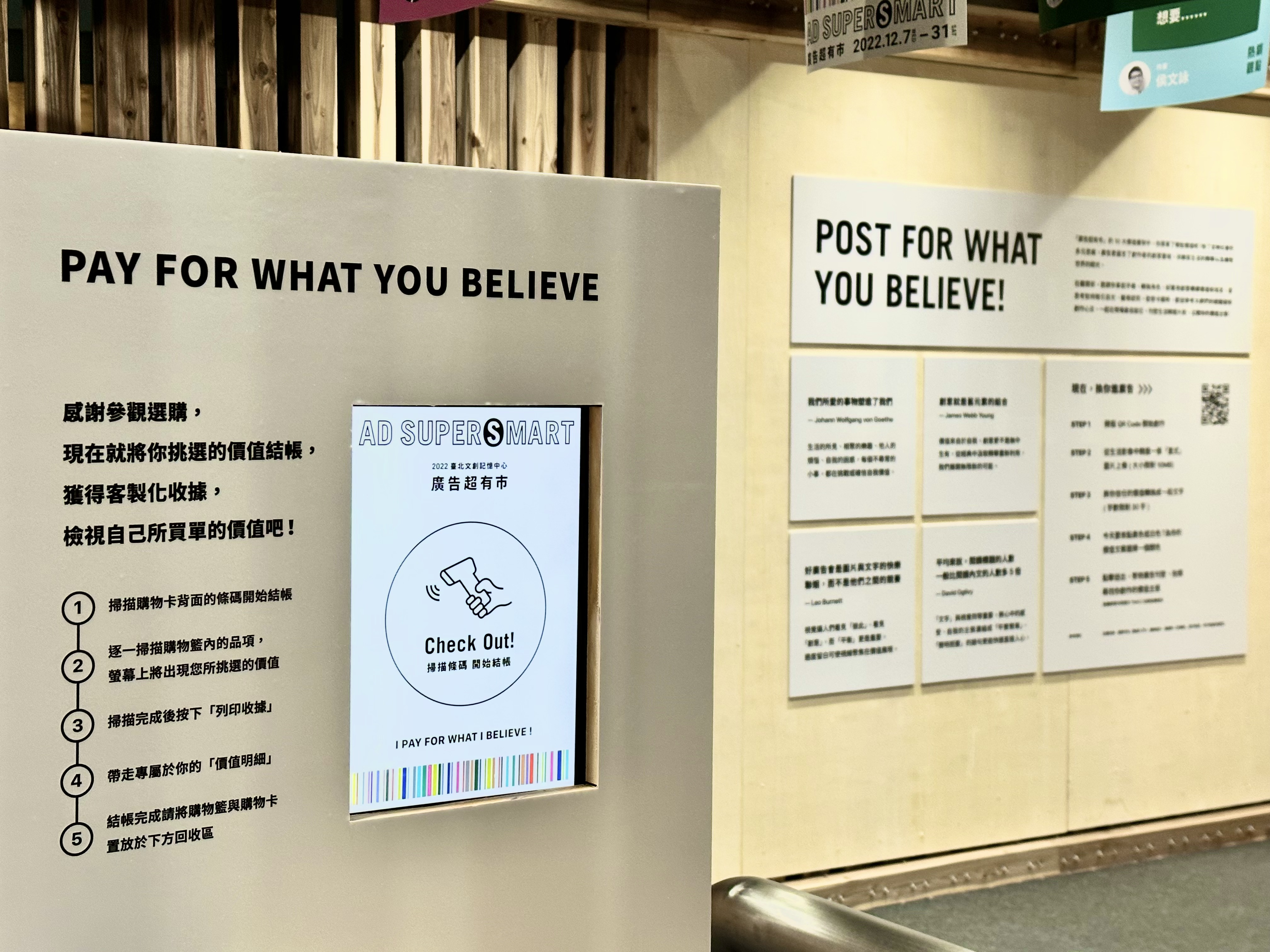 結帳完畢後,觀眾可以選擇發揮自我影響力,在此區化身廣告創意人,製作所認同的價值或觀展心得發布圖文廣告,透過現場螢幕投放,藉此感受廣告發揮的影響力。