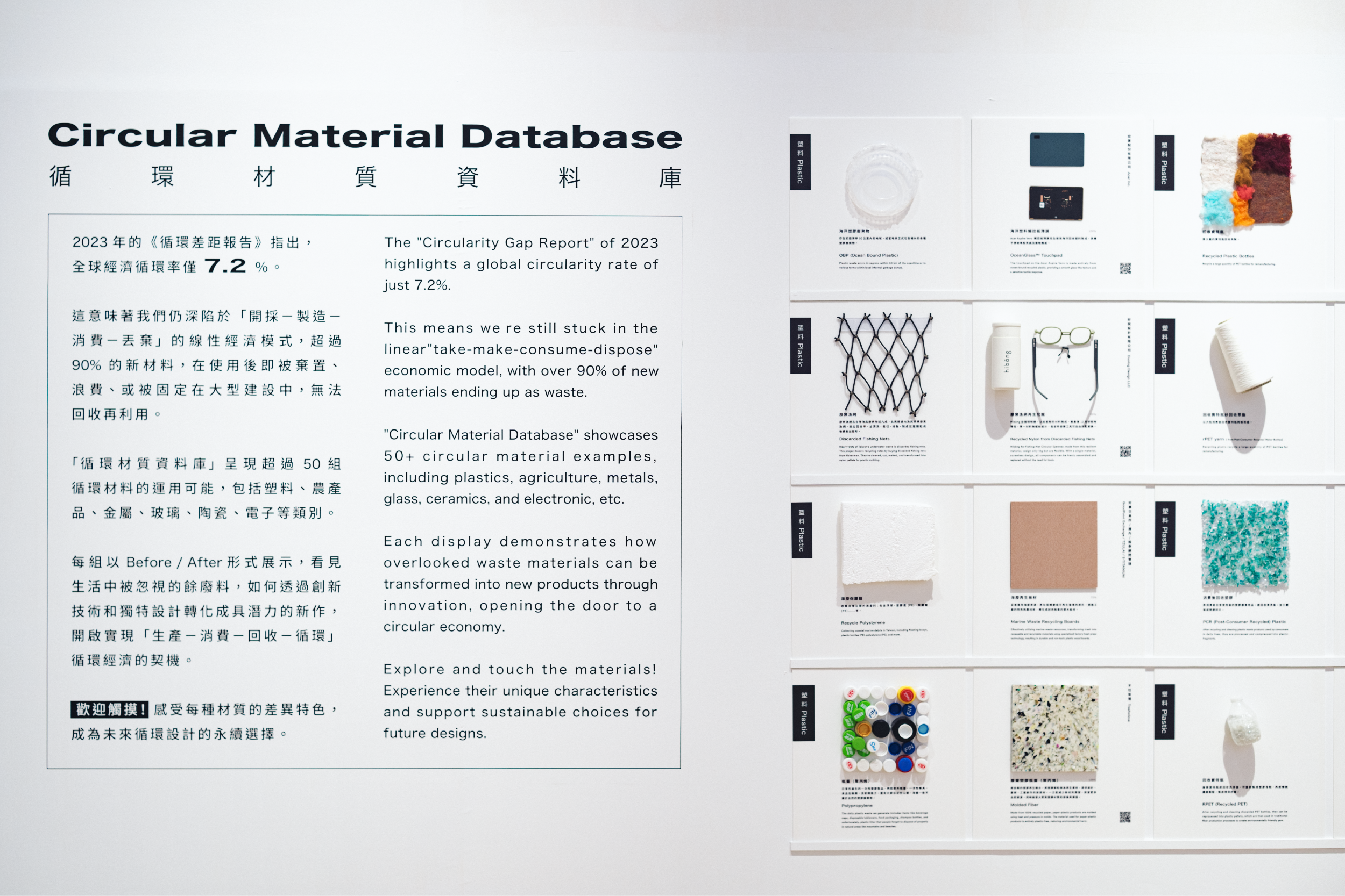 Our Circular Material Database showcases 52 recycled materials before and after regeneration, allowing viewers to touch and experience them. "Circular Material Database" which is displayed on the wall in a Before/After format, allowing everyone to see how circular materials are practically used in daily life. It provides designers with more sustainable options for future material applications and enables the public to imagine the regenerative possibilities of everyday objects.