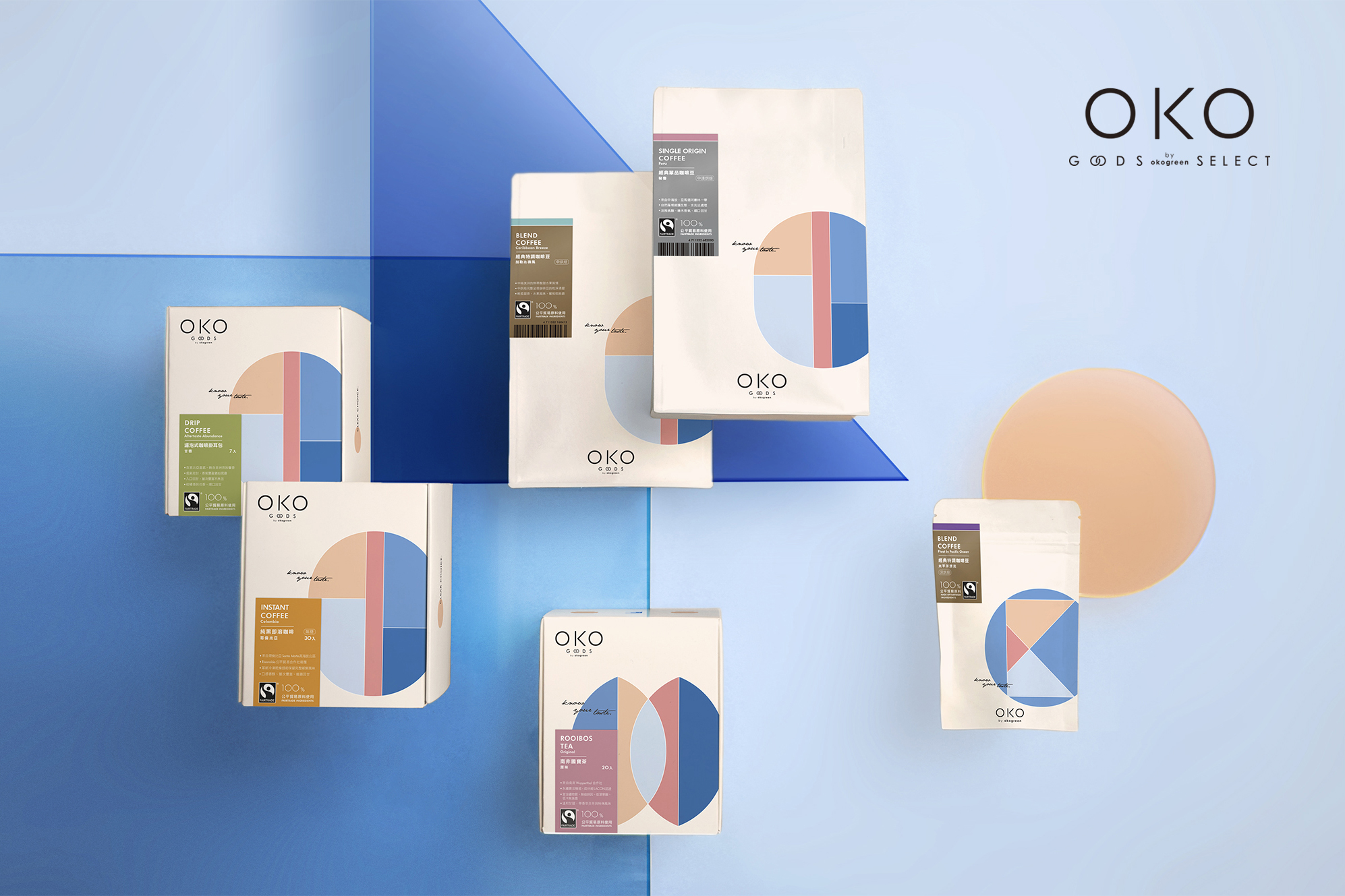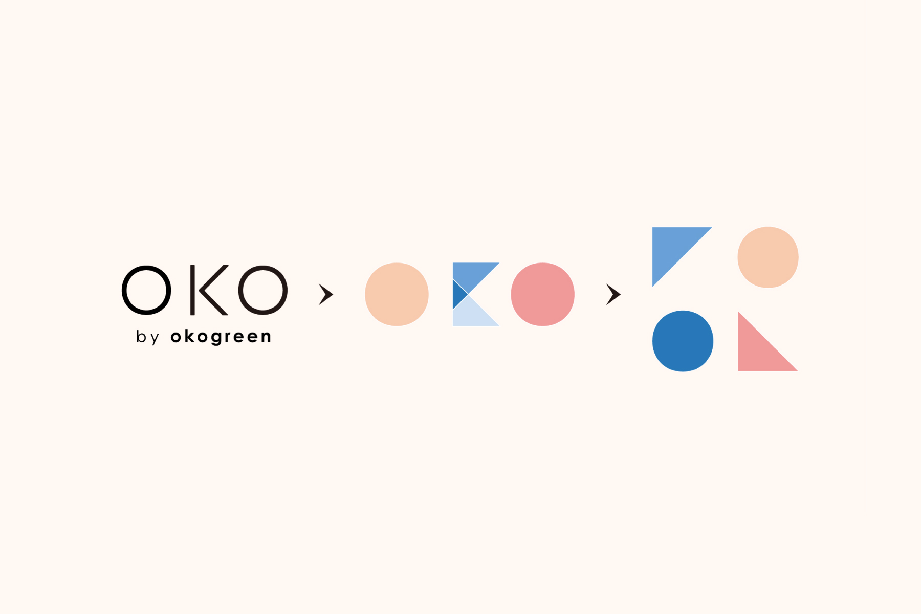 擷取 Okogreen 中 OKO 作為自有品牌名稱。透過 OKO 「眼睛」的意涵,延伸至「看見並揭露生產流程中每個細節」的堅持,使公平貿易、倫理消費的概念更加貼近生活。OKO 標誌以最純粹的幾何圖形 —— 圓形與三角形為主要視覺元素,其中字母「O」以細微的筆畫調整,用更圓潤的線條突顯人性溫度的氣息,帶出 OKO 對社會及環境多方共好的關懷。