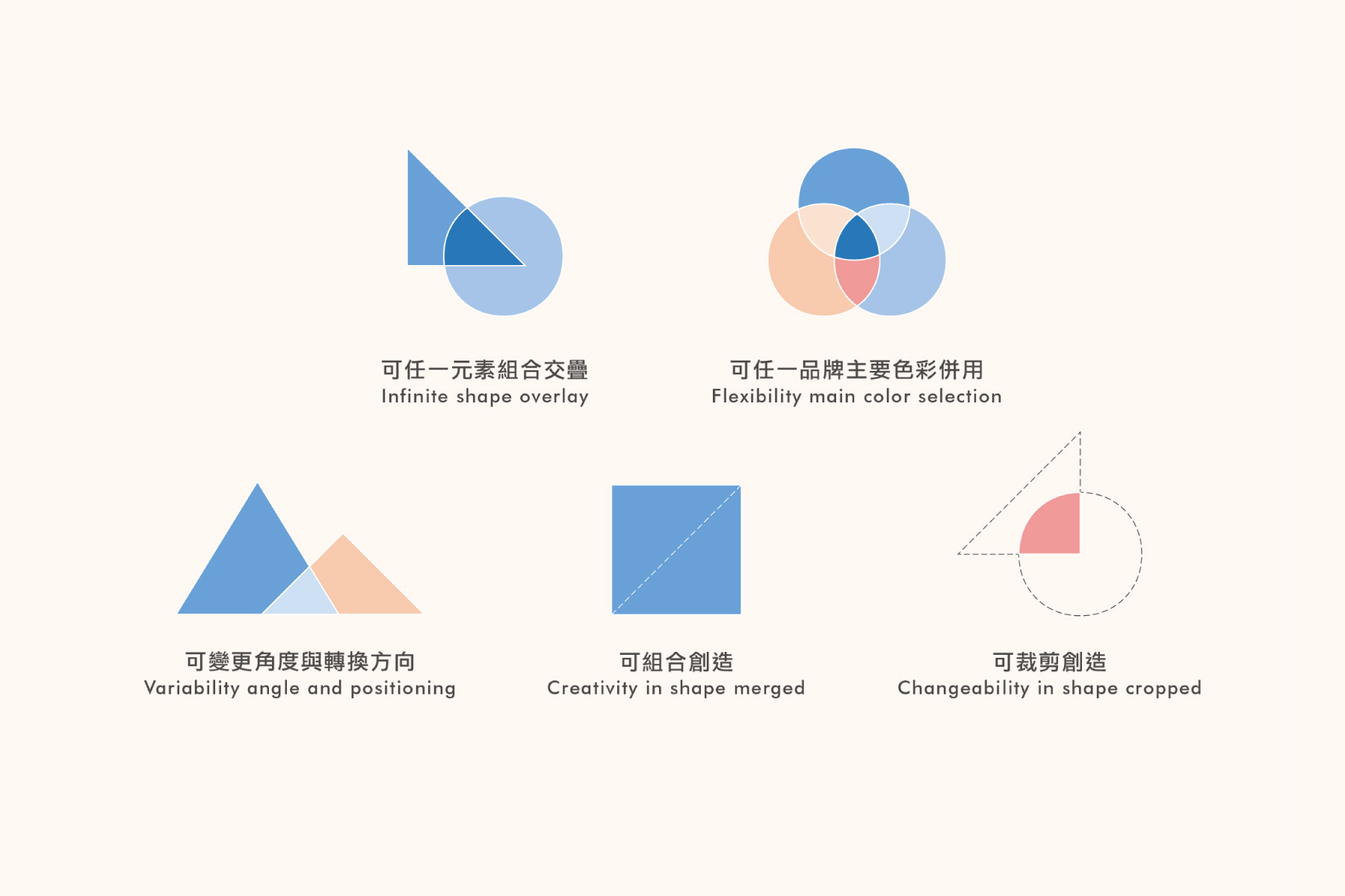 同時在品牌視覺表現上,搭配組合、裁剪等五種應用手法,創造各種圖樣,使其富有變化性且不失簡練質感。結合彩色透明物件交疊處顏色疊加的疊色原理,具體轉化為視覺元素應用手法,讓「透明」概念得以在各式媒介上呈現。