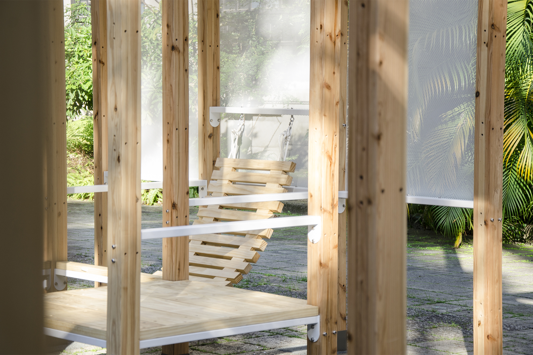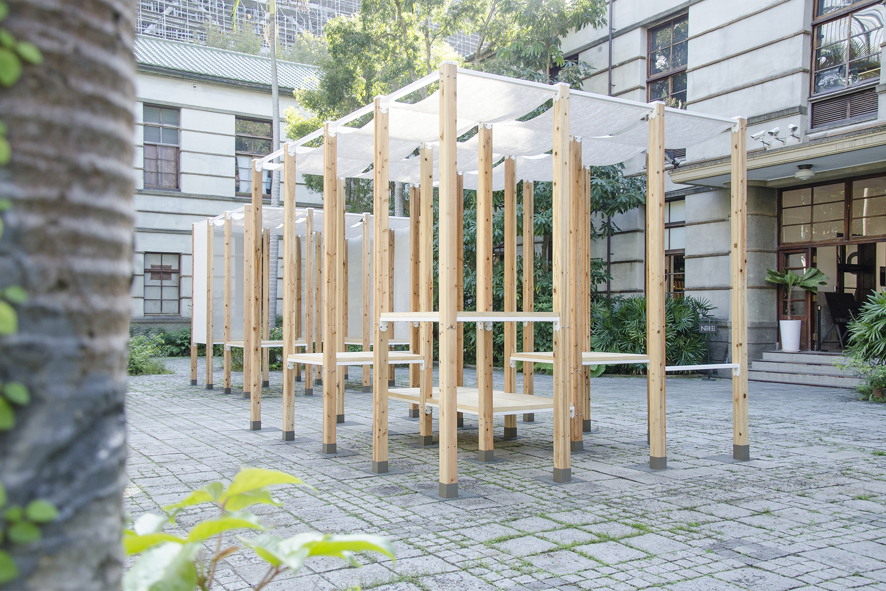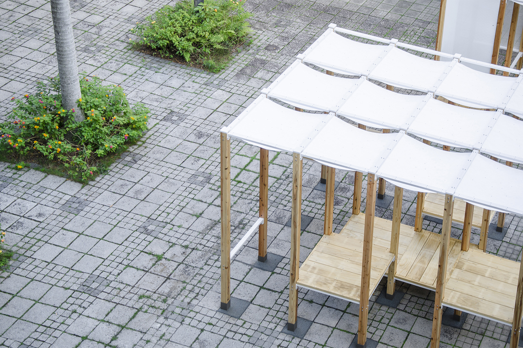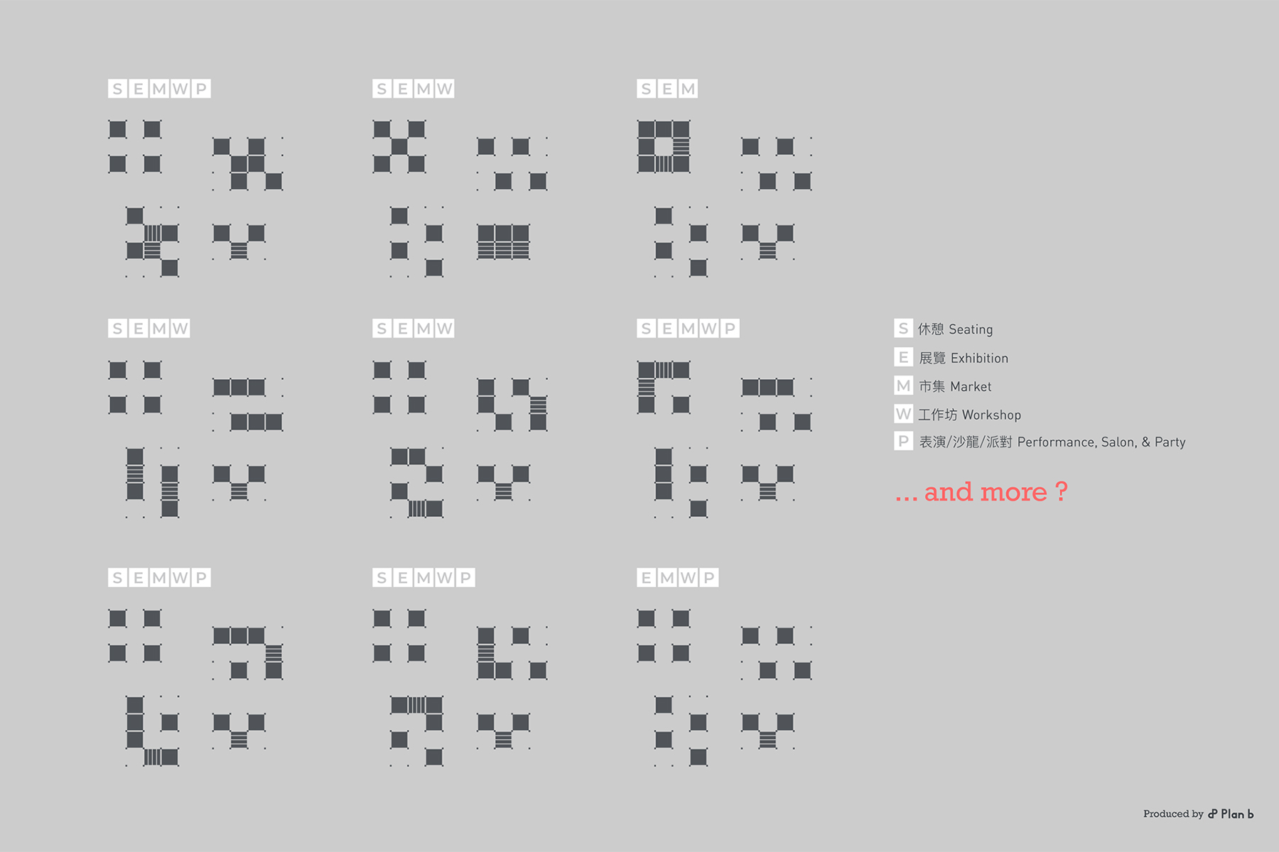 搭配組件的設計發展出如戶外模組傢俱系統一般,可以自行拆裝的模組化裝置系統。各類錯落在不同高度的平台裝置,回應各種使用需求,產生出多種配置變化。這種「變動」的特性,使得空間的構成及常時的運用能保有自我調整的彈性,達到此場域最迫切的匯聚任務。