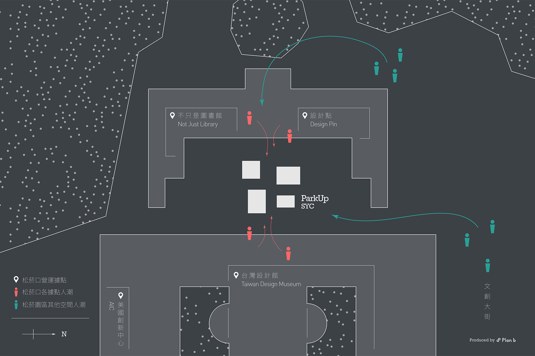為了降低裝置對於周遭建築環境的視覺影響,ParkUp SYC 逐步拆解形成四個分區。分區之間的主、次要通道,延續古蹟建築的對稱軸線,也將來自各個方向的人流導引匯聚。廣場未來的活動以靜態休憩為主,如作為不只是圖書館 Not Just Library 增進閱讀體驗的延伸空間、 台灣設計館戶外使用的展覽空間,以及各類市集、工作坊的場地等。