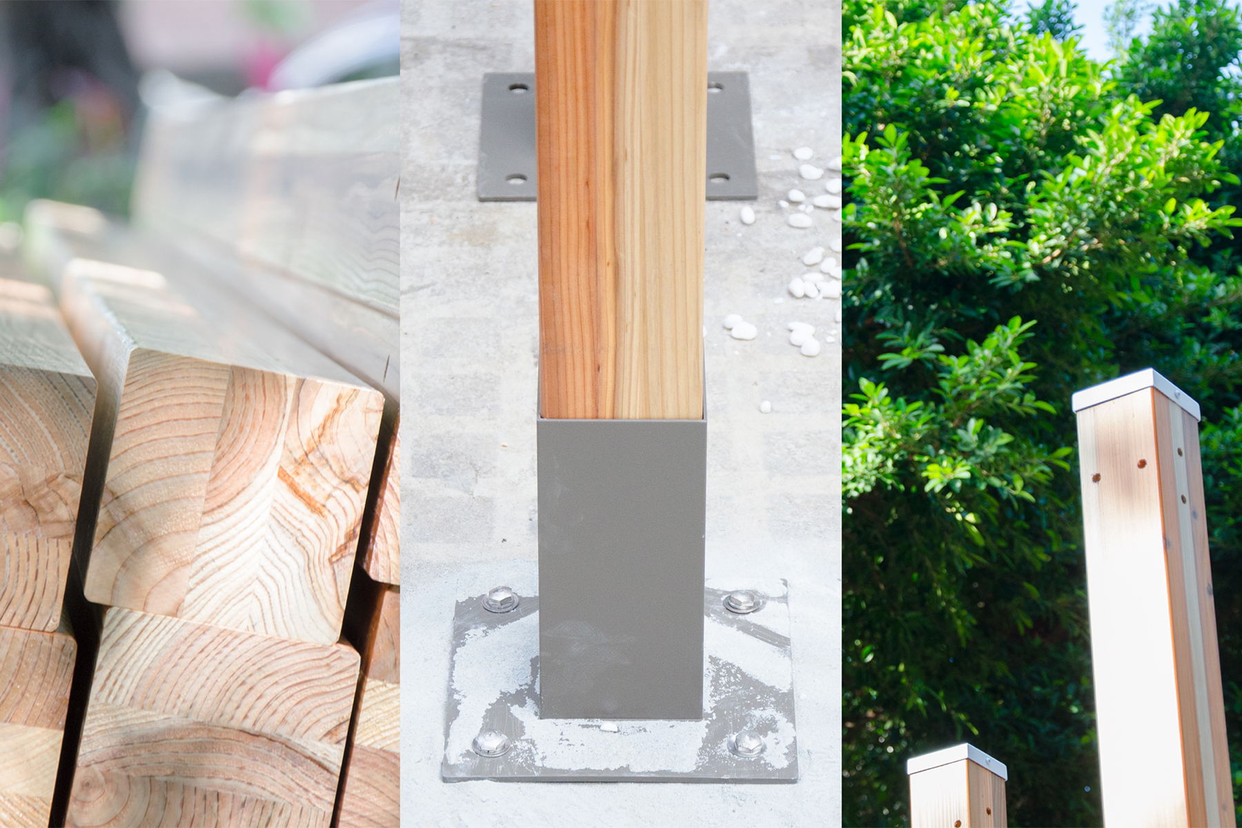 ParkUp Tools 以 木、鐵 等永續材料,作為整套系統的基礎元件。木材方面,特別與國內少數具有 FSC 認證的正昌製材有限公司合作,使用台灣國產柳杉來製作柱結構,以自然材料建構都市空間的永續性。