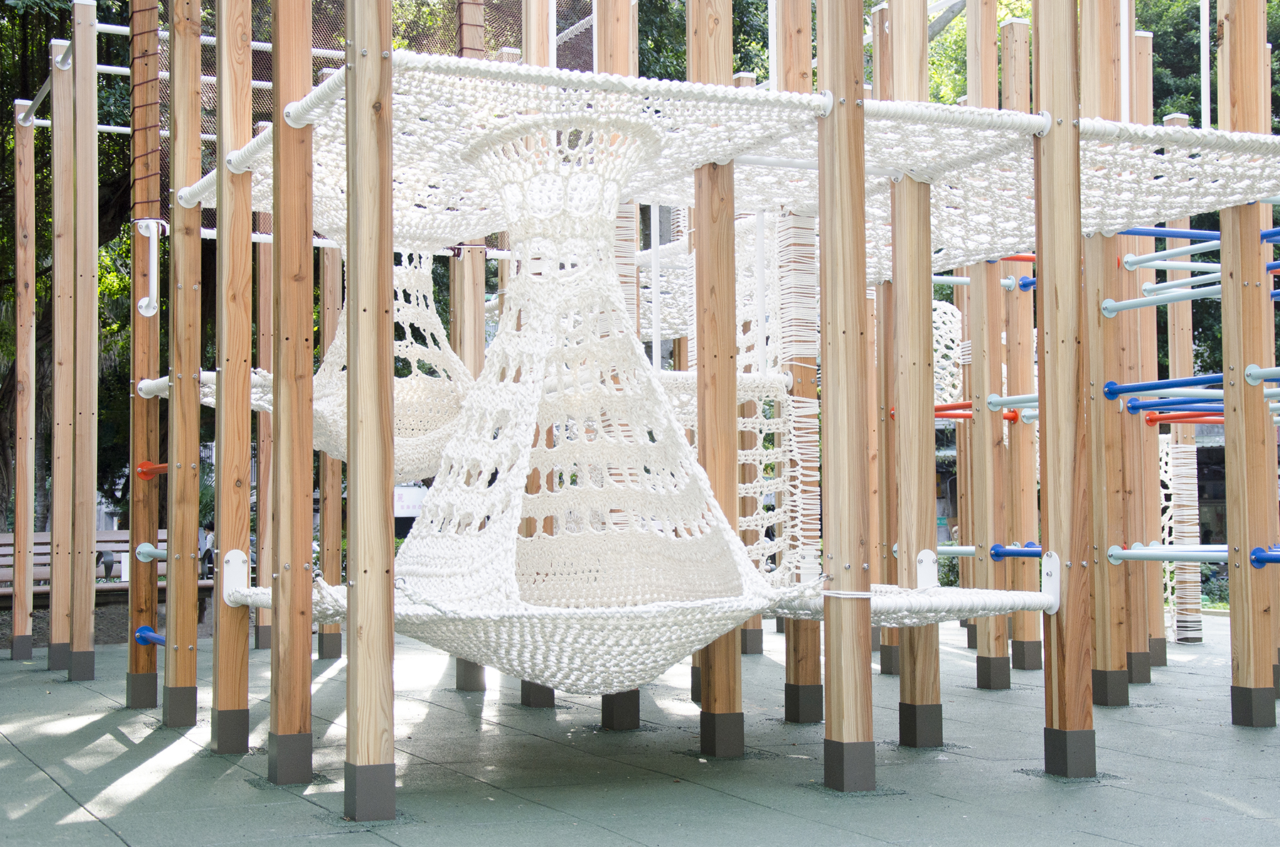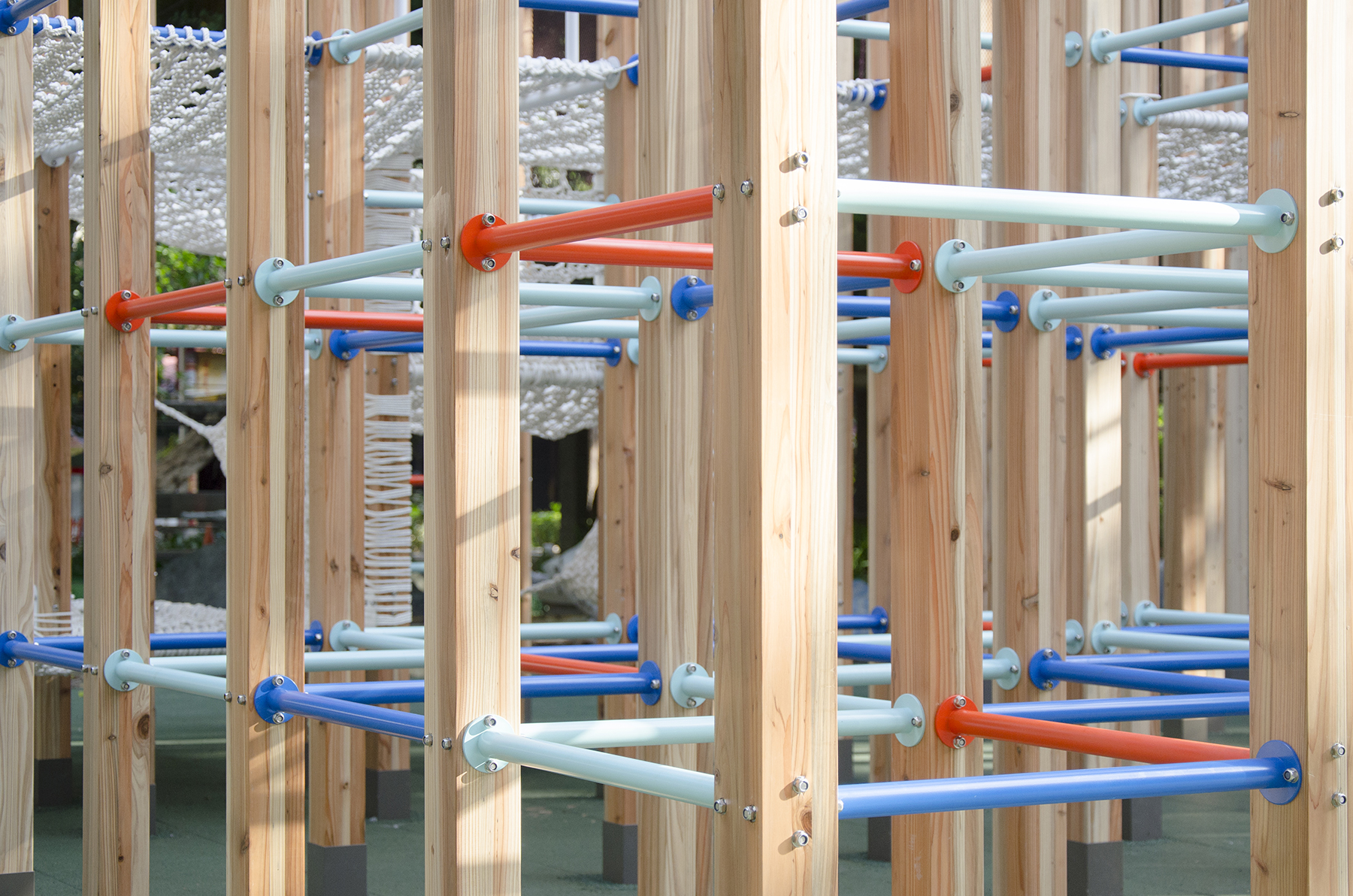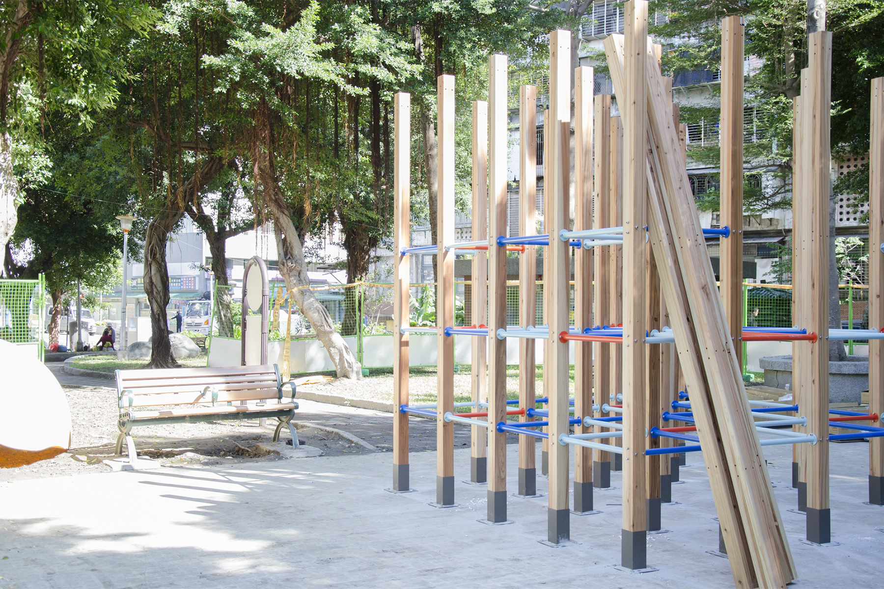 透過基地觀察,回應不同活動的需求,在地化的配置型態,調整柱間距以符合不同族群使用。客製化設計相應的組件:遊戲空間的攀爬架、編織網,提供不受侷限的遊玩方式;可變動的木平台,能依展演活動需求,調整並找到適切的使用型態。