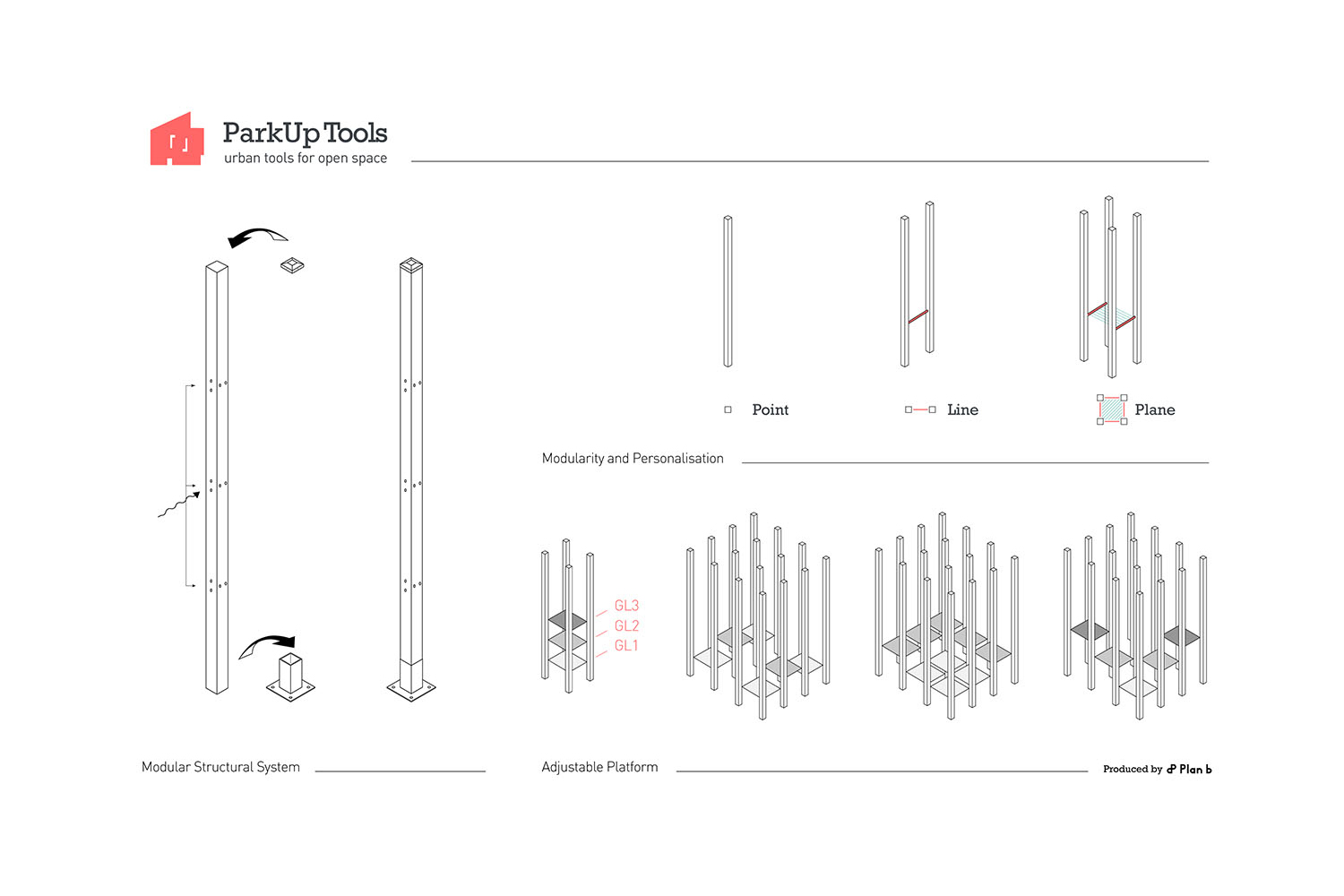 為了讓都市中的閒置空間,成為適應在地的開放空間,ParkUp 與公司內部的永續研發團隊合作,導入永續發展工具(SD tools),發展出一套可因地制宜的模組化結構系統(modular structural system):ParkUp Tools。
