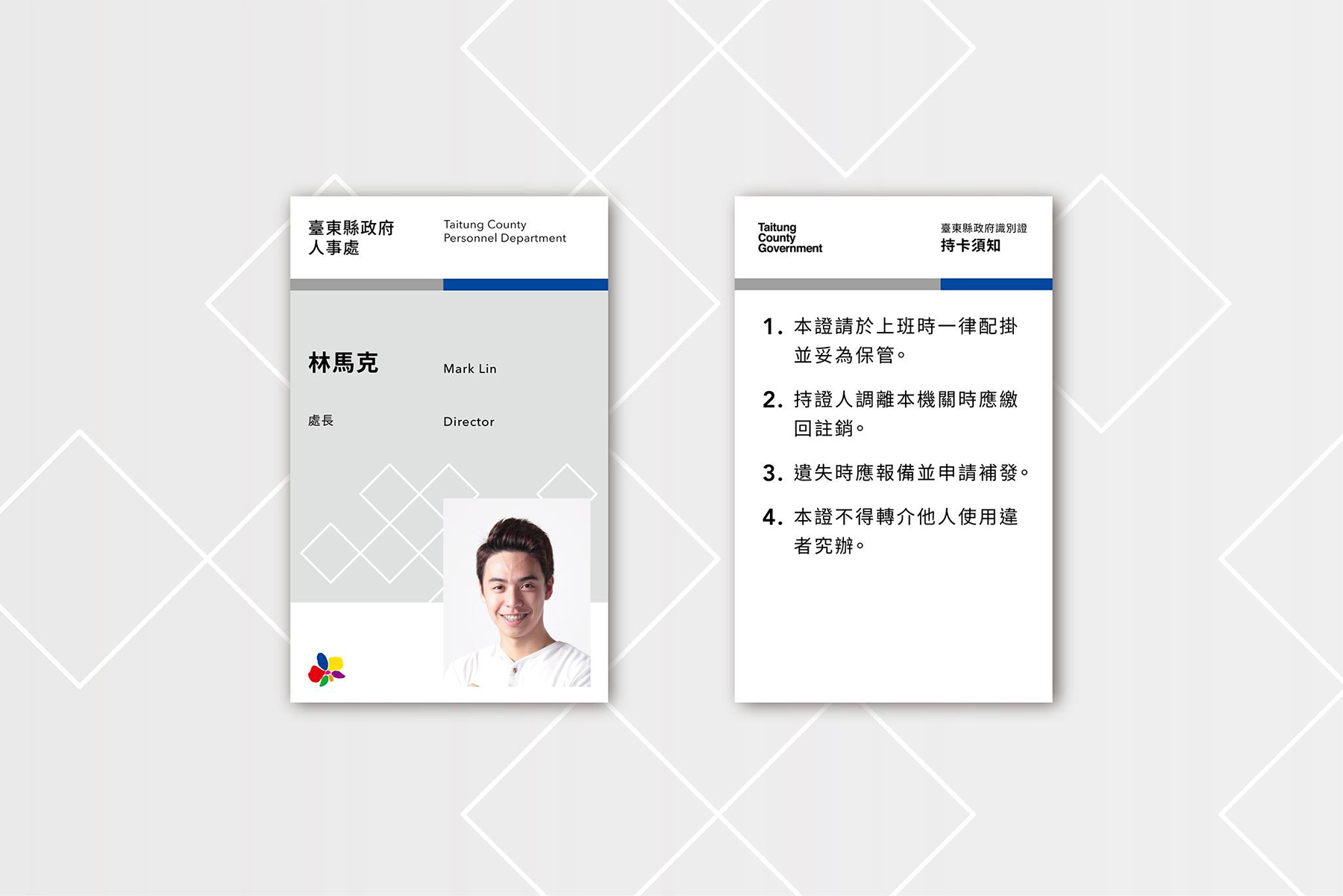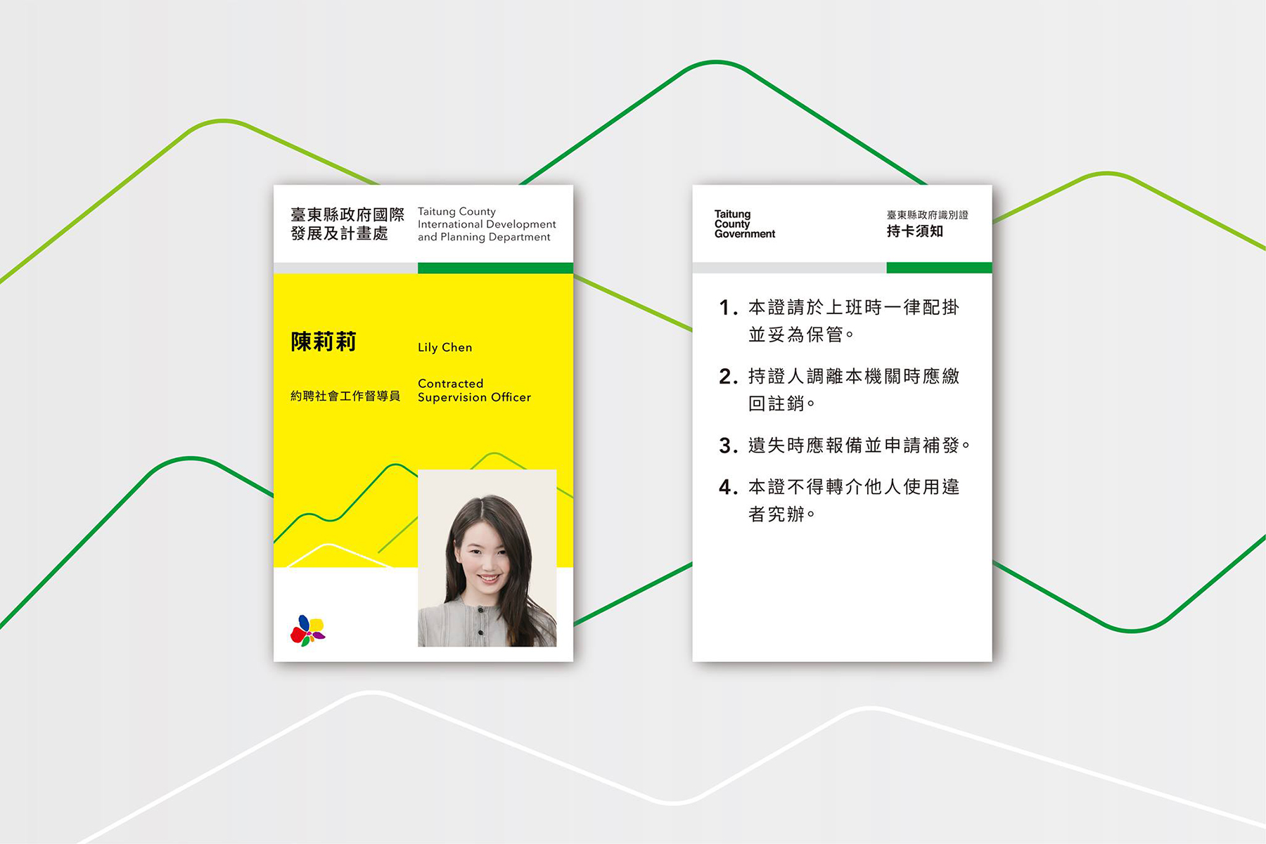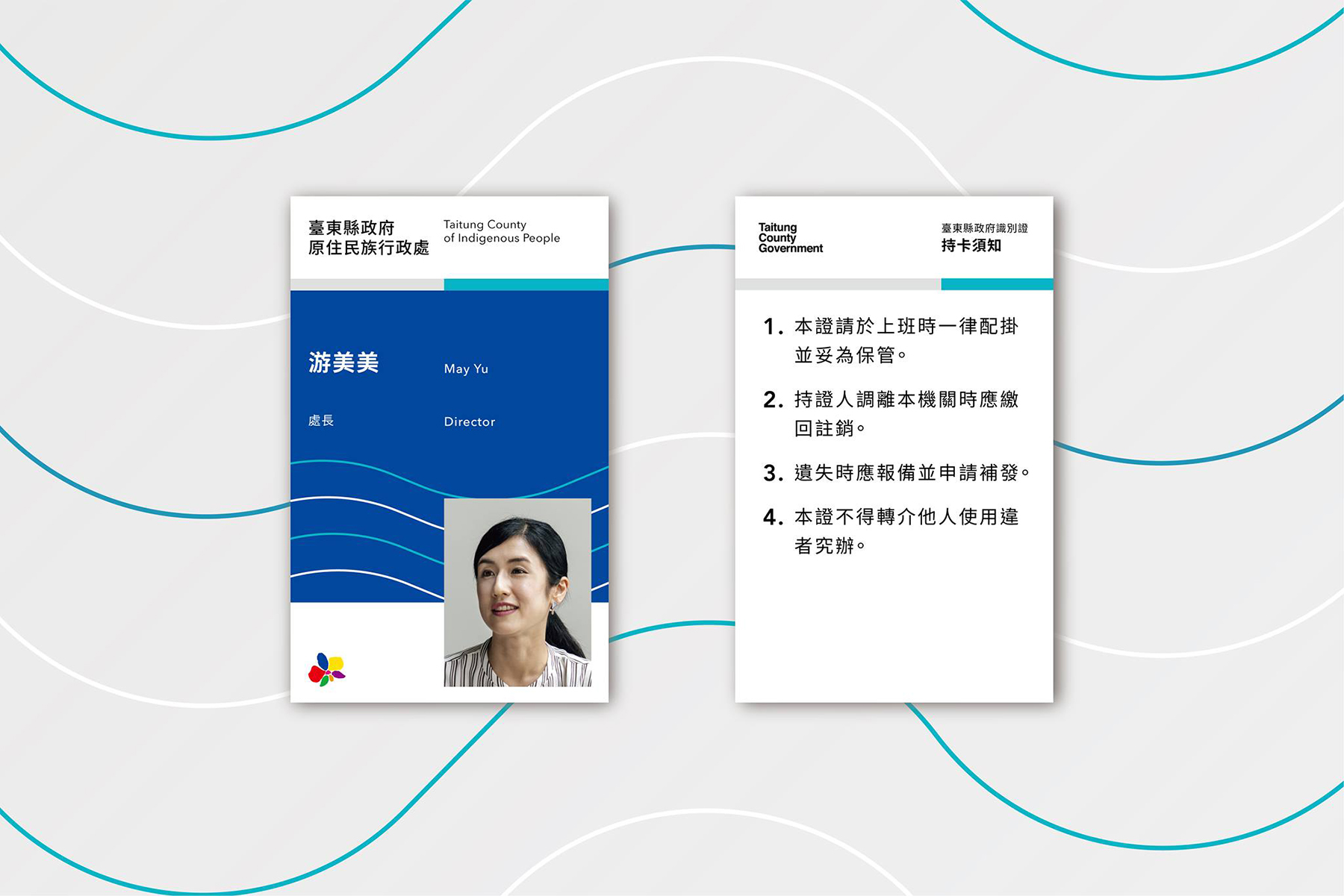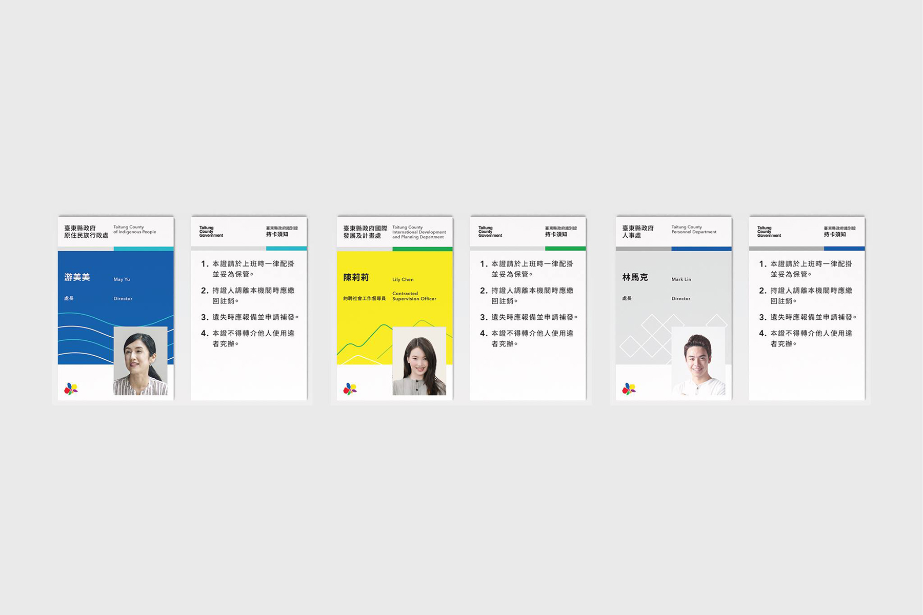 延續縣政府名片再設計的整體視覺風格,以及「試圖重新詮釋臺東多元山海與族群和諧共存」的核心概念,翻轉過去識別證單純功能性的資訊呈現,透過資訊層級的重梳、加入以「山 / 海 / 人」為題的臺東視覺元素為識別證加分。