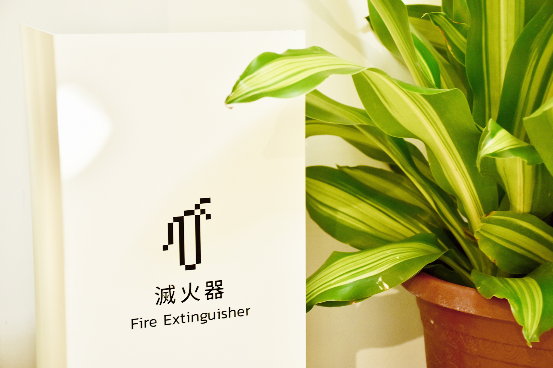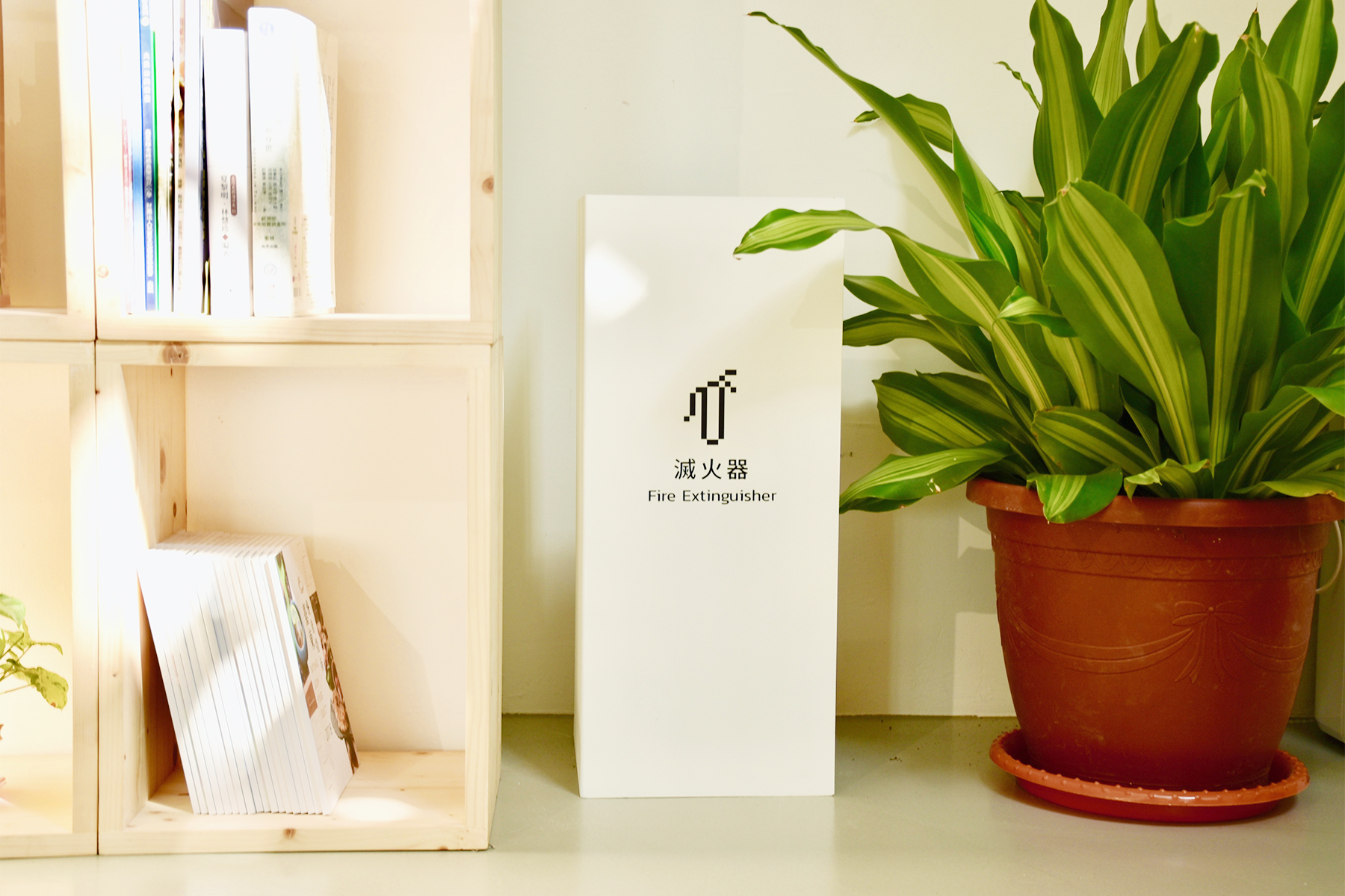 「消防系統指標」的設計提案以滅火器指標為設計切角,將原來滿版的紅色指示牌調整為適合場域的白底。為了讓指示牌在空間中仍然清楚可供辨識,因此在顏色的選用上刻意與既有牆面有所差異;同時也將指示牌從平面圖示轉換為立體的折板形式。在指標系統的呈現上,則延續了 臺東設計中心 的語彙,以點陣化的格點簡化滅火器的具體型態。透過指示牌的設計提案,我們讓滅火器原本帶有強烈警示意味的存在,轉為與環境和諧的提示作用。