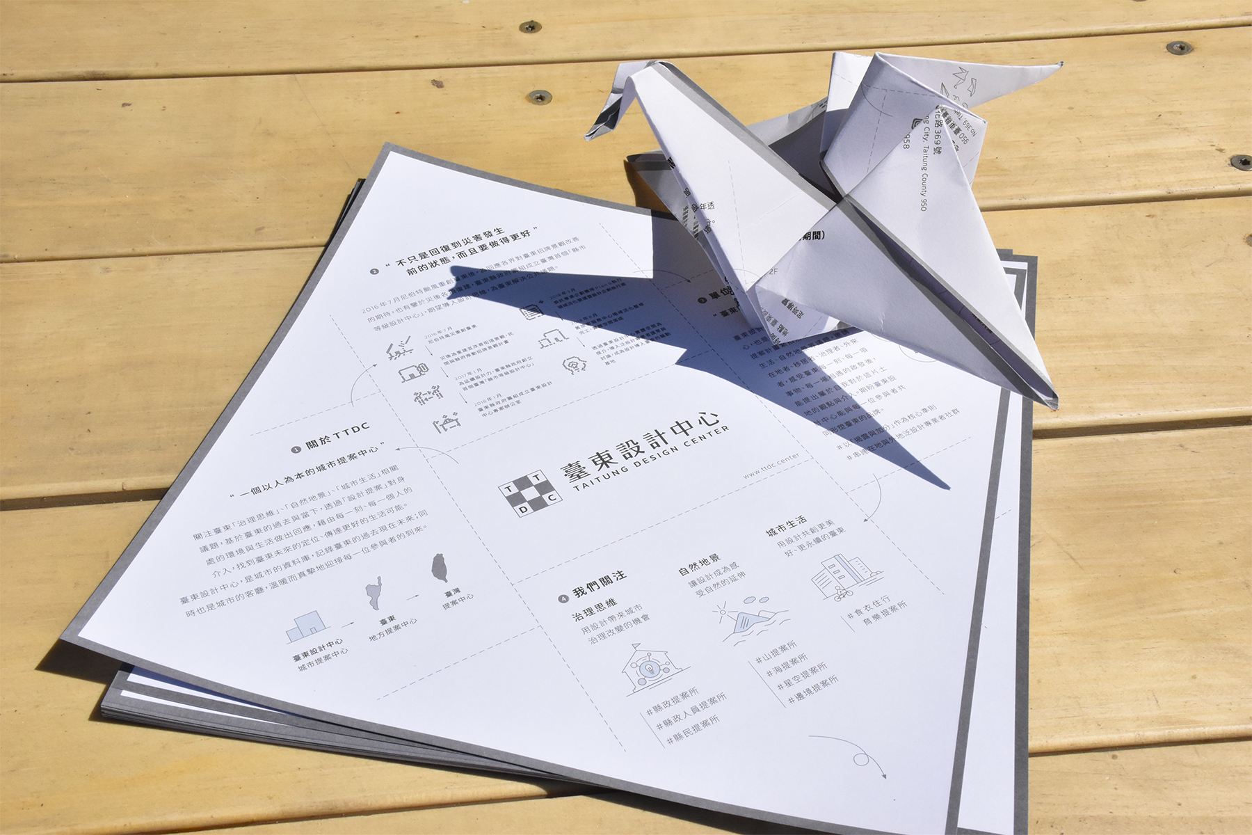 臺東設計中心單位與空間介紹 DM,希望使宣傳物不只是傳遞訊息,而是延續設計中心為「提案中心」的精神,做出示範性達到加分與揭露的用途。此次設計以「摺紙提案」出發,跳脫一般制式 DM 的排版尺寸以「正方形」設計,再刻意將 DM 紙張設計成菱形的排版,暗示摺紙的第一步。期望訪客在閱讀完資訊後能利用 DM 製作屬於自己的摺紙提案。後續以線上方式規劃摺紙提案企劃,將 DM 摺成各形式之動物或物件,並把成品放置在臺東大自然的一處,進行臺東資源揭露達到為用小企劃為臺東加分、為公部門宣傳物做出示範的可能性。