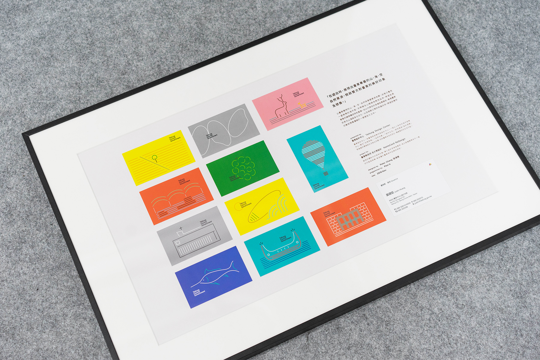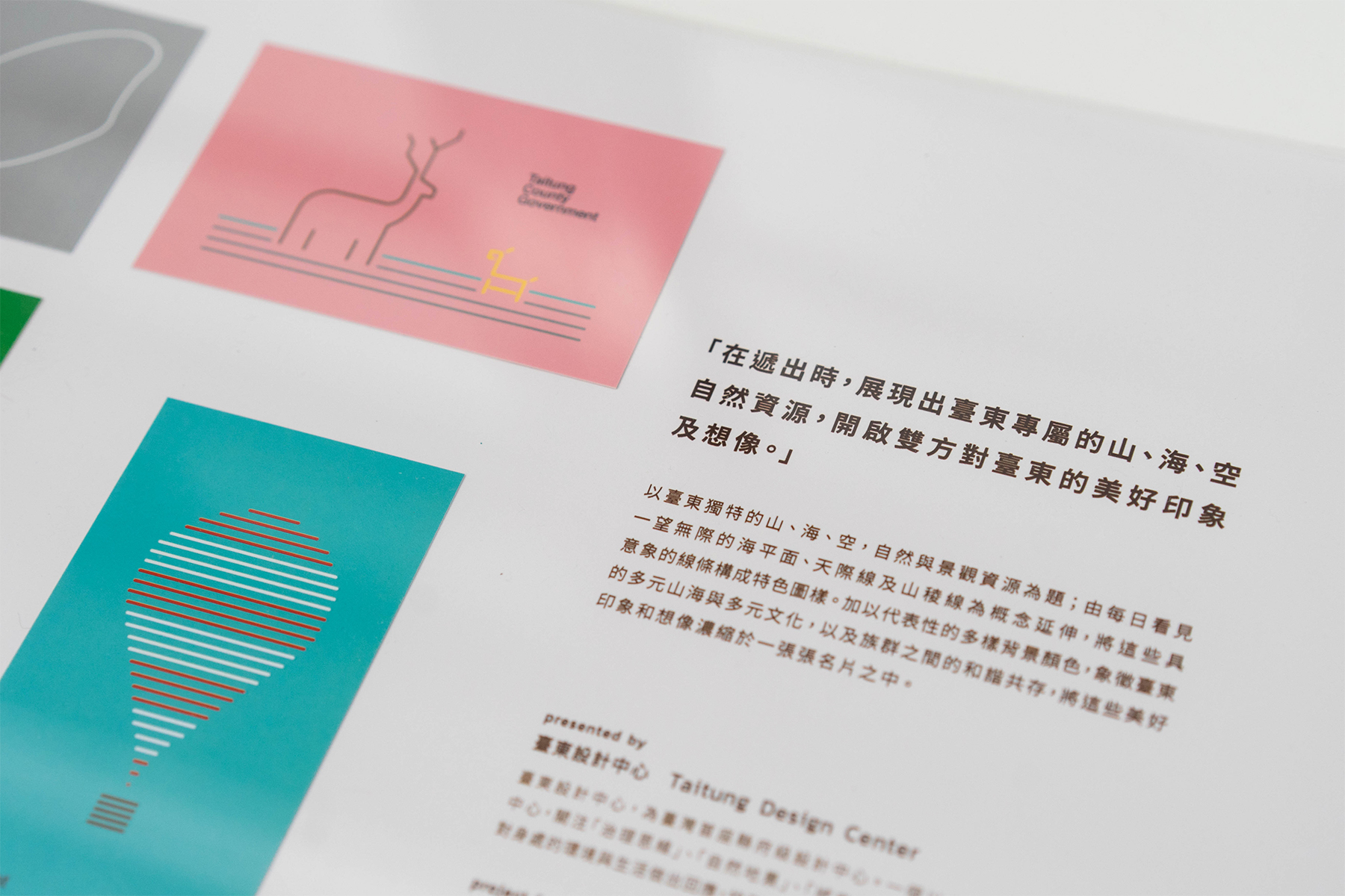以臺東獨特的山、海、空,自然與景觀資源為題;由每日看見一望無際的海平面、天際線及山稜線為概念延伸,將這些具意象的線條構成特色圖樣。加以代表性的多樣背景顏色,象徵臺東的多元山海與多元文化,以及族群之間的和諧共存,將這些美好印象和想像濃縮於一張張名片之中。