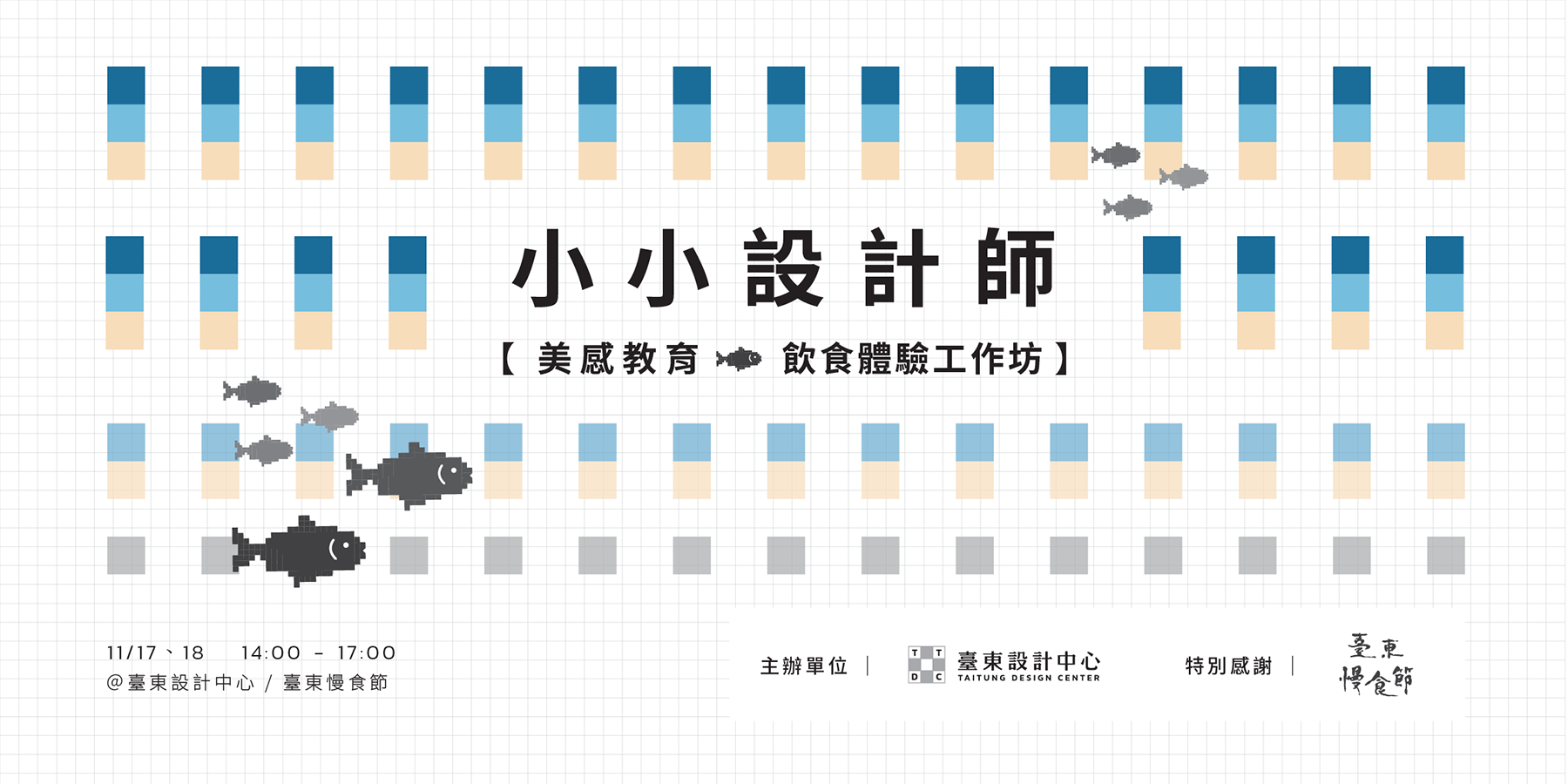 「美感教育 X 飲食體驗工作坊」由臺東設計中心聯合臺東慢食節,設計「美感認知、飲食探索、創作設計」三部分活動,活動中建立孩童對於美感教育核心面向「色彩」及「構成」的基本理解,並實地於臺東慢食節現場採集在地特色料理中味覺與視覺的美感素材,最後將相關素材應用於創作體驗。